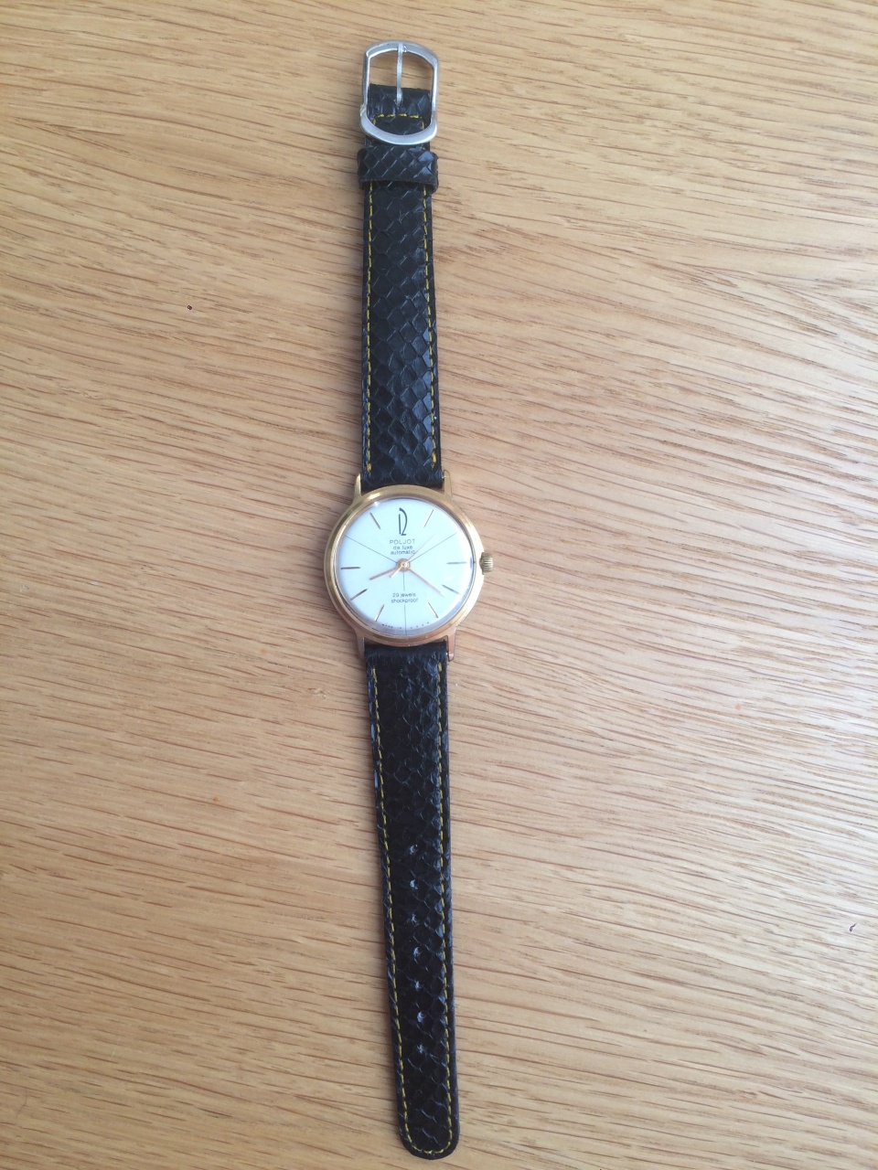 4800р – Poljot de luxе automatic 29 камней. Часы на довольно редком ремешке из натуральной кожи змеи производства ЛПО «Петродворцовый Часовой Завод», черного цвета с желтой прострочкой (состояние ремешка – очень хорошее т.к. не ношеный). Плюсы часов: хорошее состояние циферблата, стекла, механизма (автоподзавод работает). Минусы: присутствуют потери позолоты по корпусу. Когда-то долго искал именно такое исполнение циферблата. Часы носились мной пару раз, сейчас решил все что не ношу продать. Дополнительные фото могу скинуть. Пересыл, опыт продажи на форуме есть.