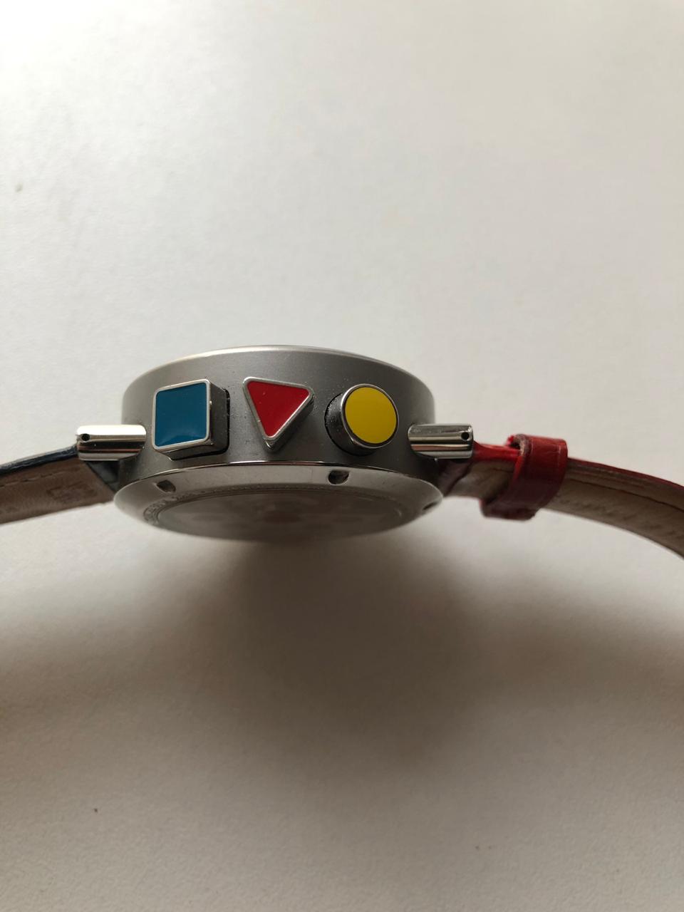 Две большие кнопки - круглая и квадратная и большая треугольная заводная головка - из стали, покрыты желтым-красным-синим лаком