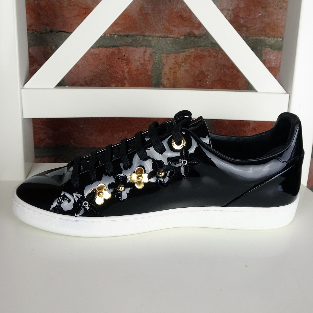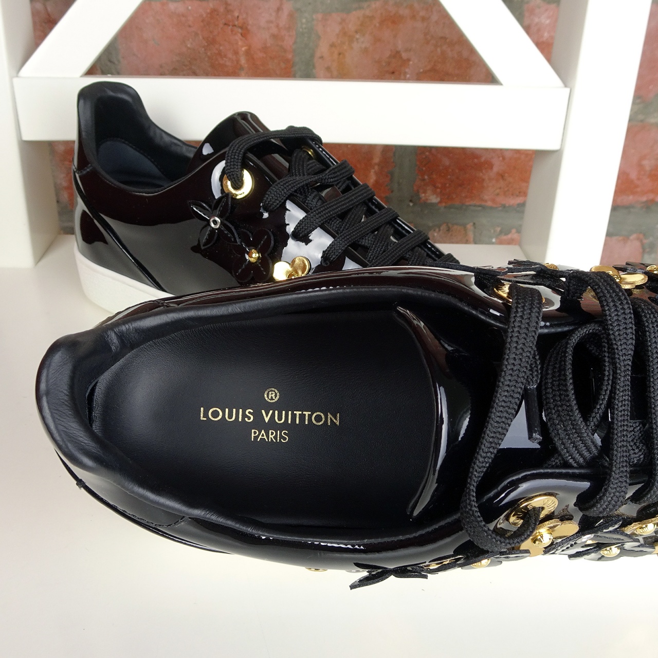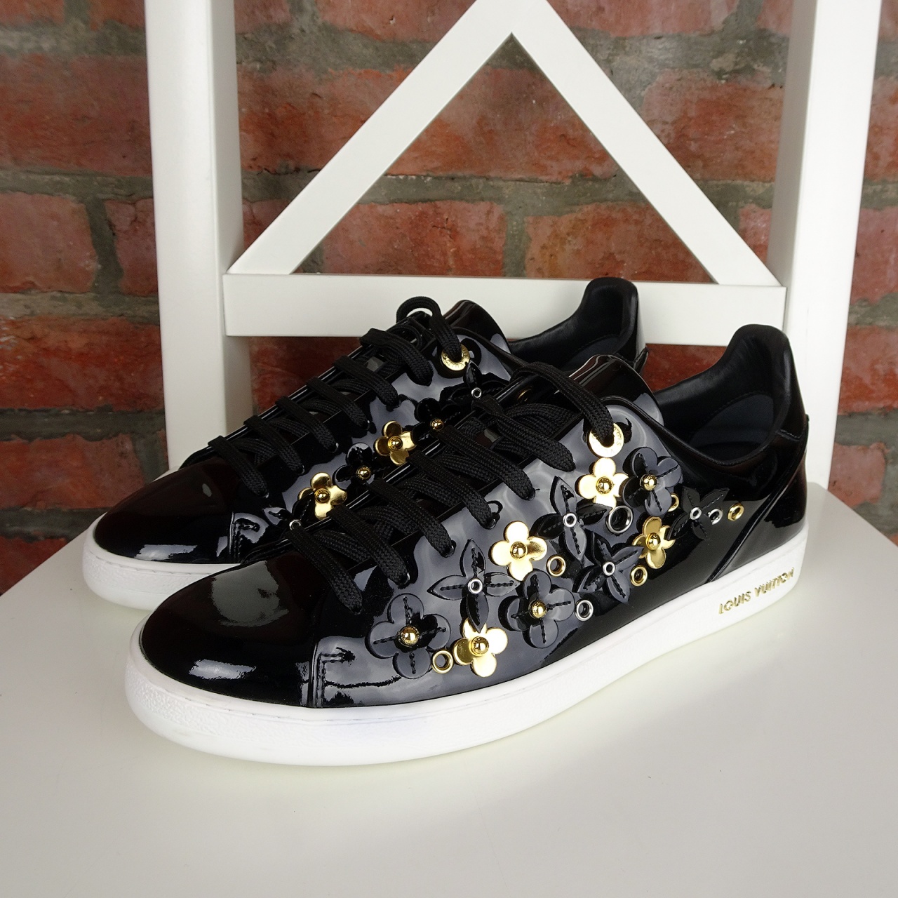 "Новая версия легендарных кроссовок Frontrow - великолепный образец высокого стиля Louis Vuitton. Рокошный контраст черной лаковой кожи и белой подошвы дополнен сиянием лепестков цветов узора LV Monogram. Неподвластный времени дизайн знаменитых кроссовок украшен роскошным декором из серебряных и золотых люверсов и объемных цветков-символов Louis Vuitton из лаковой кожи черного и золотого цветов."