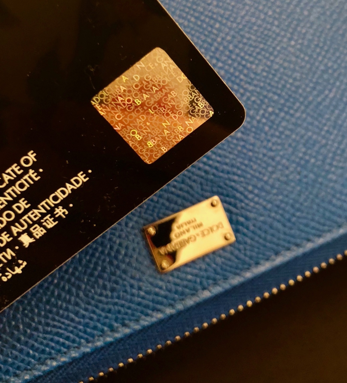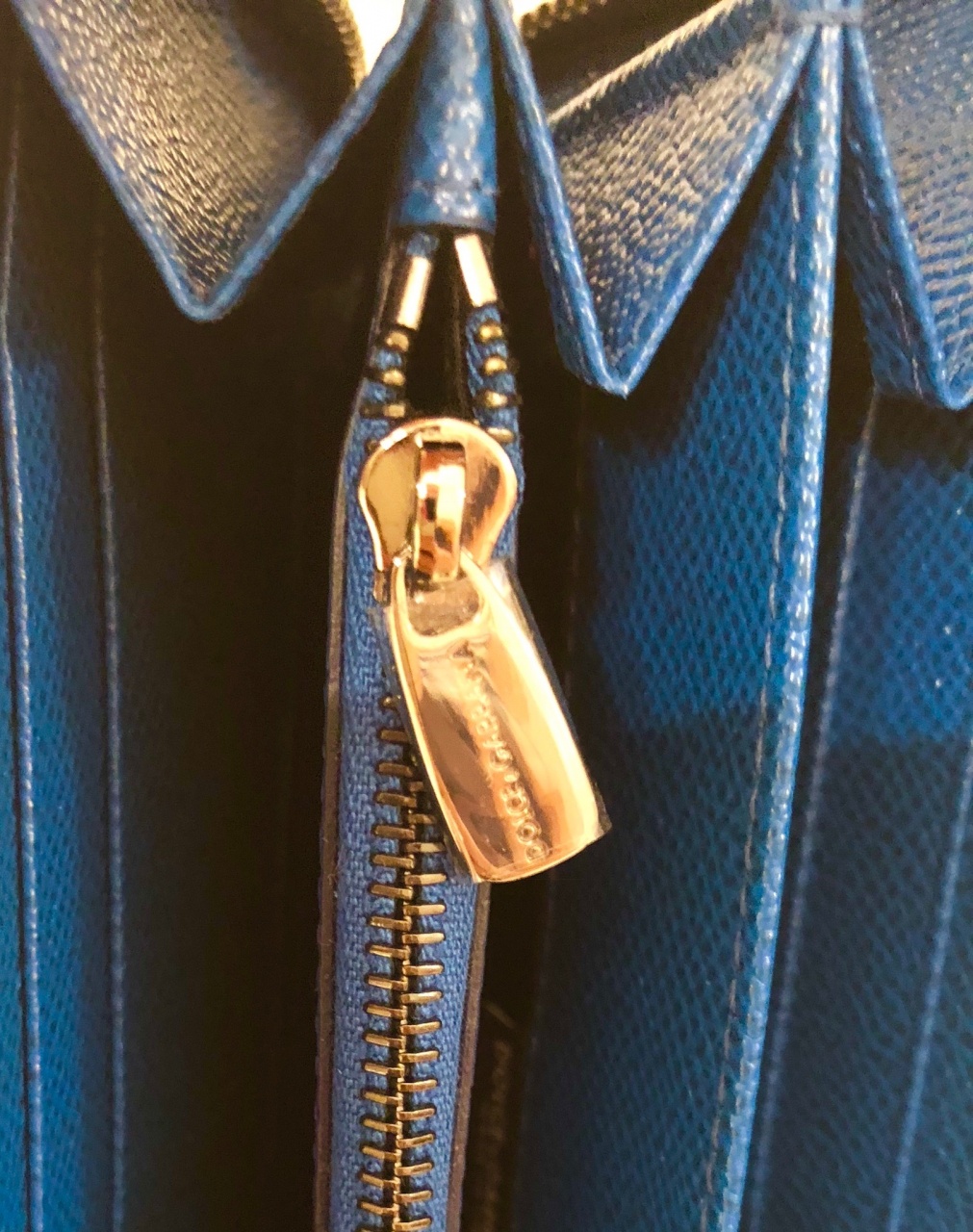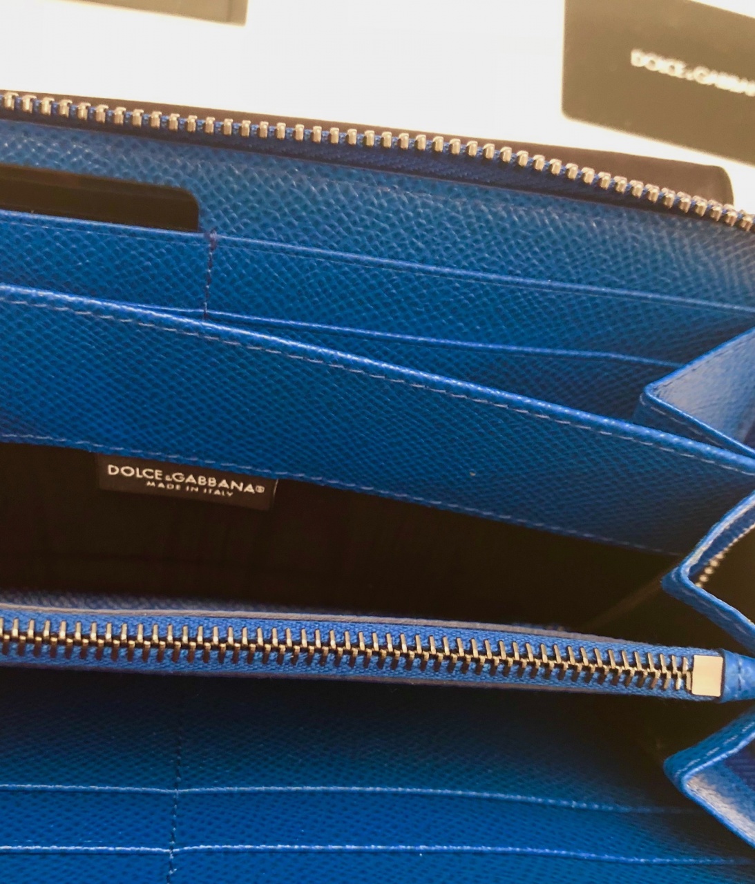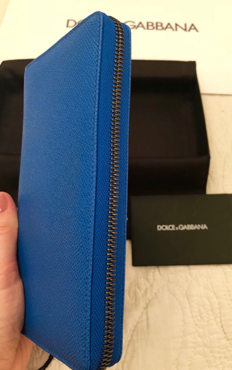 Портмоне на молнии по периметру, 3 больших отделений для купюр + одно на молнии для мелочи, 12 слотов для кредиток. Натуральная телячья кожа с легким матовым блеском знаменитой выделки Dauphinе (фирменная выделка Dolce), яркий сине-морского оттенка. Внутри отделка кожей и тканью, язычки молний и фурнитура черненые, лаковые, с тиснением бренда. Легко помещается паспорт, ПТС, права, много купюр любого размера.