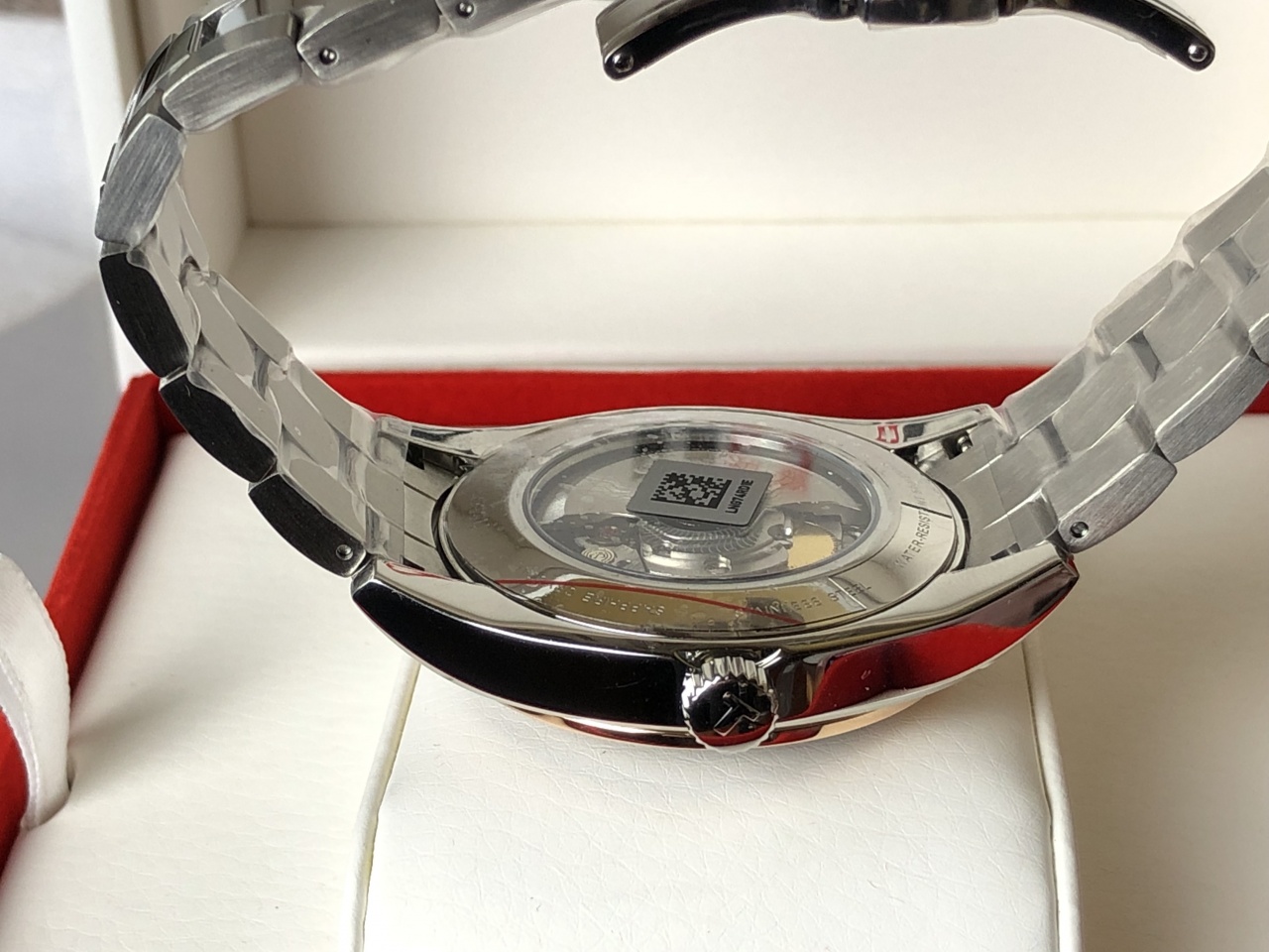Часы интересны действительно золотым безелем (5 грамм, сертификат прилагается), стрелками и часовыми метками. Внутри Powermatic 80 с кремниевой, антимагнитной балансовой спиралью. Это совместная разработка Audemars Piguet и Swatch Group.