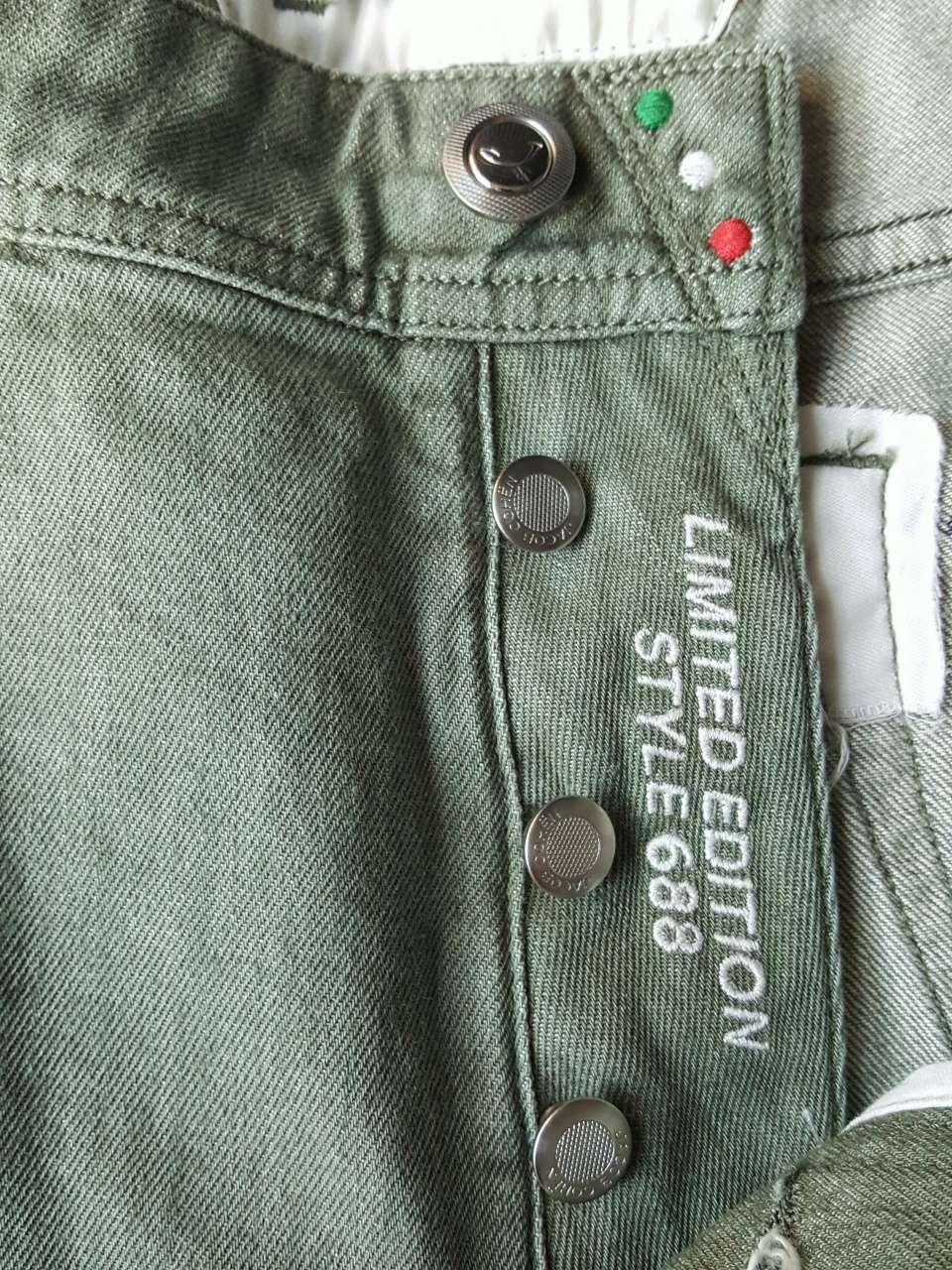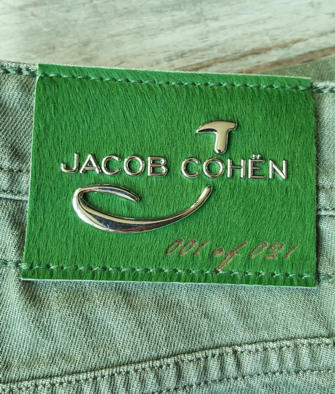 Сзади на правом бедре джинсы имеют фирменный ярлык из меха пони зеленого цвета с логотипом марки Jасоb Соhеn, выполненный из металла, что указывает на принадлежность к "лимитированной" линейке марки и порядковый номер - 001