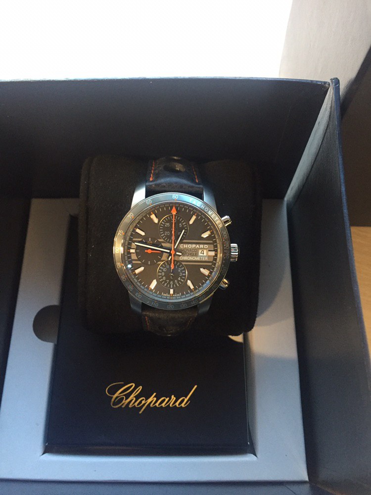 Любителям скорости и точных измерений придется по вкусу хронограф, разработанный компанией Chopard и адресованный истинным ценителям часового искусства. Кнопки управления хронографом имеют приятную, обтекаемую форму, которая сливается с дизайном часов, образуя цельную художественную композицию. Часы выполнены в корпусе из титана размером 42,4 мм. Толщина корпуса составляет 14,67 мм. Механизм с автоматическим подзаводом работает от амплитуды движения руки. Эти часы с водонепроницаемостью 50 м позволят вам плавать в бассейне или принимать душ. Циферблат закрыт прозрачным антибликовым стеклом из сапфирового хрусталя высокой прочности, благодаря чему обеспечивается максимальная защита от сколов и механических повреждений. Для изготовления задней крышки корпуса часов также применяется сапфировое стекло, благодаря чему обеспечивается обзор на работу часового механизма. Ремешок из натуральной кожи с простой титановой застежкой превосходно дополняет изысканный образ модели. Хронограф. Запас хода до 48 часов. Задняя крышка прозрачная.