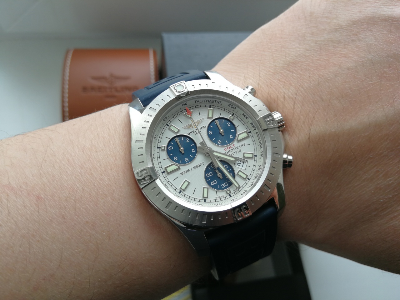 Данный экземпляр представлен в шикарнейшей на мой взгляд расцвете - белый циферблат с синими колодцами, смотрится просто круто!!!