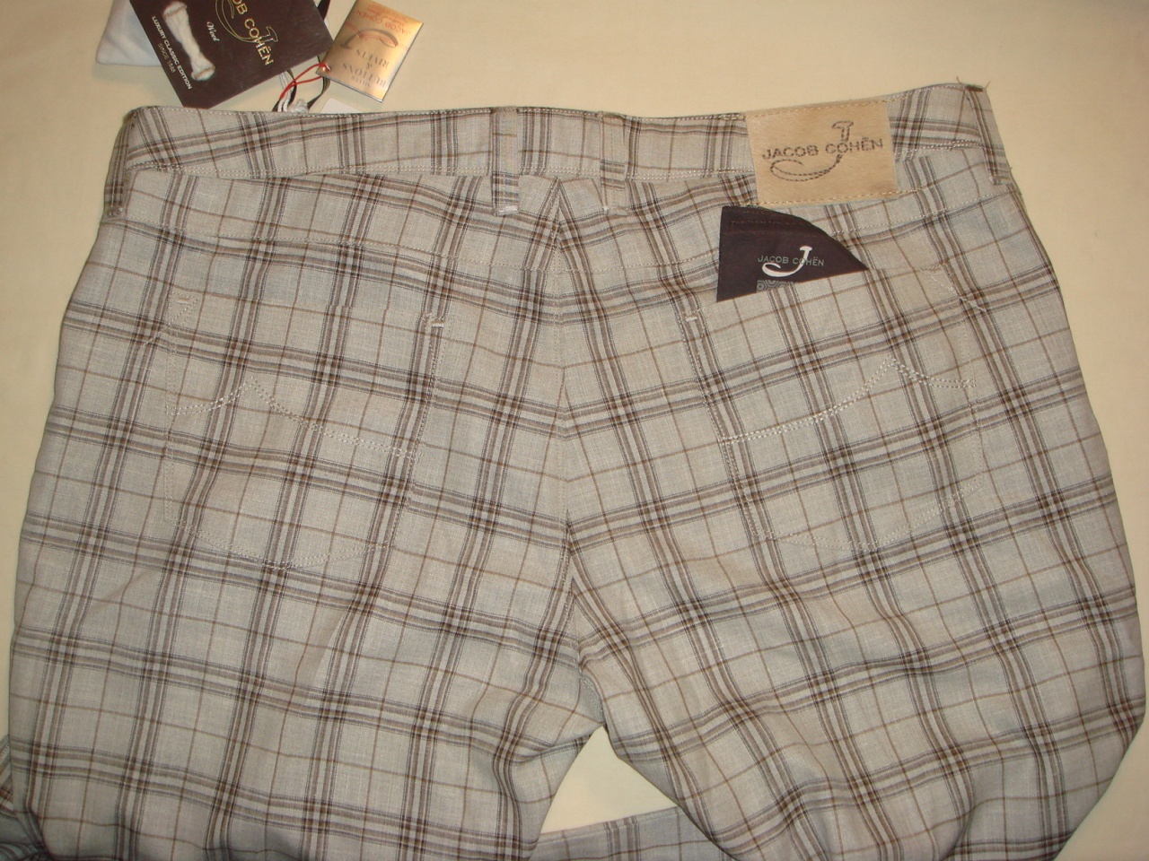 Продаются новые мужские летние шерстяные брюки джинсового кроя ручной работы итальянского бренда JACOB COHEN, превосходного исполнения, цвет светло-серый в коричневую клетку, логотип, TYPE 688 , клаcическая посадка на талии (regular fit), застёгивается на пуговицы из буйволиного рога и основную фирменную посеребренную пуговицу с логотипом бренда, фирменный ярлык из кожи пони бежевого цвета с вышитым логотипом марки Jасоb Соhёn, к брюкам прилагается платок, состав: 70% высококачественная шерсть( фабрика Loro Piana) , 15% шелк, 15 % лен, все бирки прилагаются , гарантированный 100% оригинал, размер 42 , производство Италия