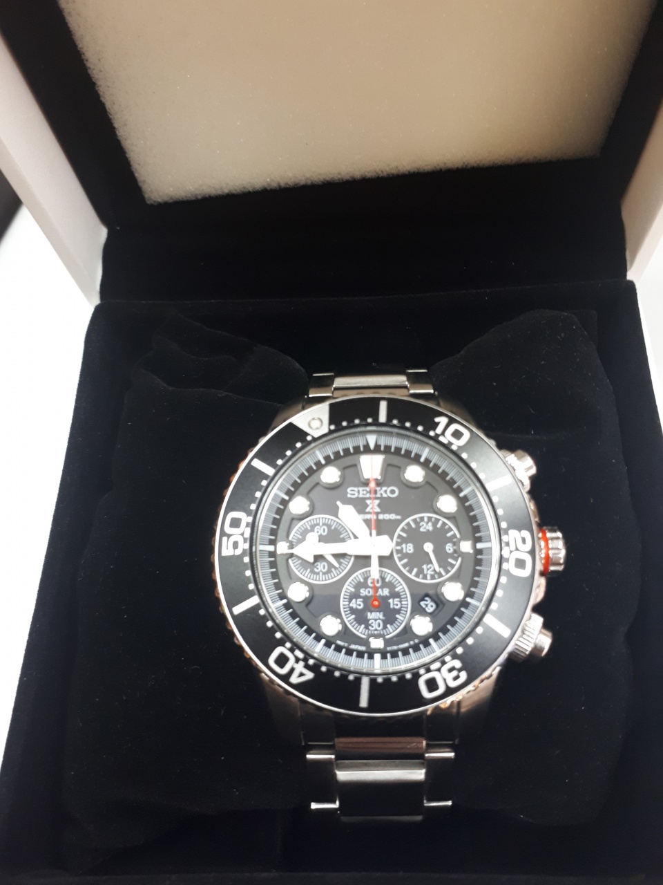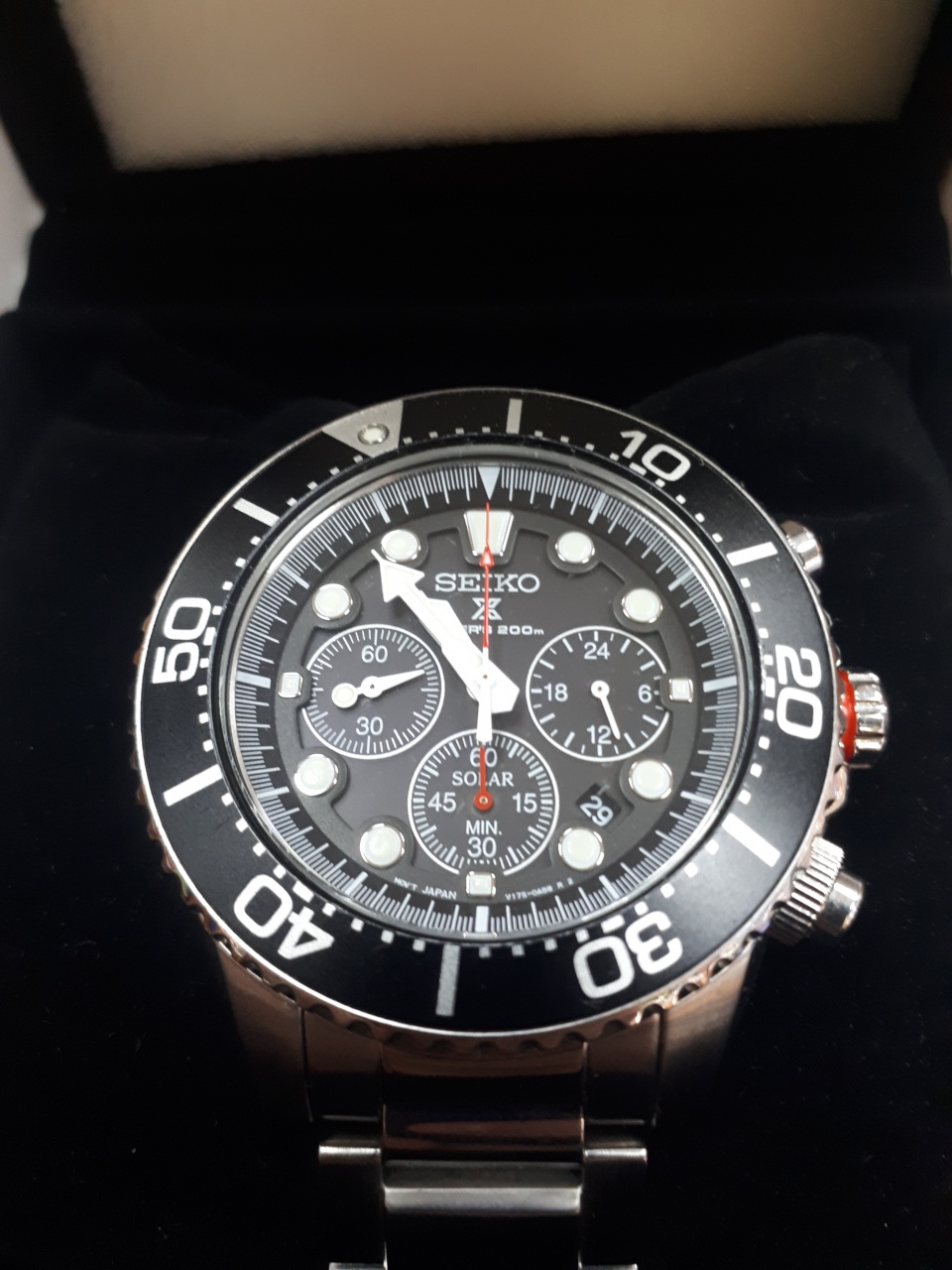 Divers. Питание от солнечной энергии. Часы-хронограф с секундомером. 12-ти и 24-х часовой формат времени. Вращающийся безель. Завинчивающиеся заводная головка и кнопки управления хронографом.