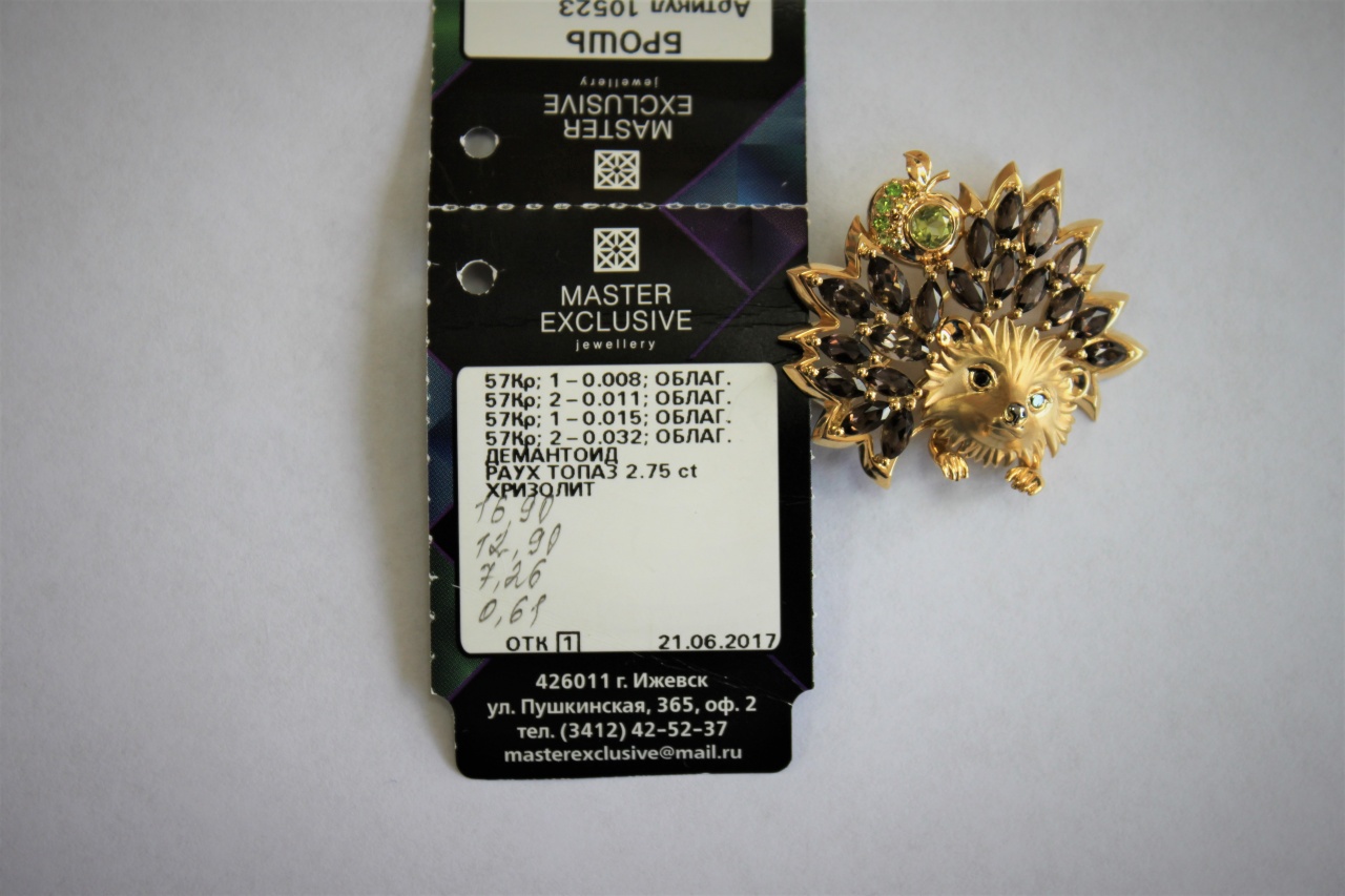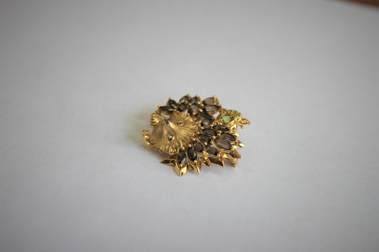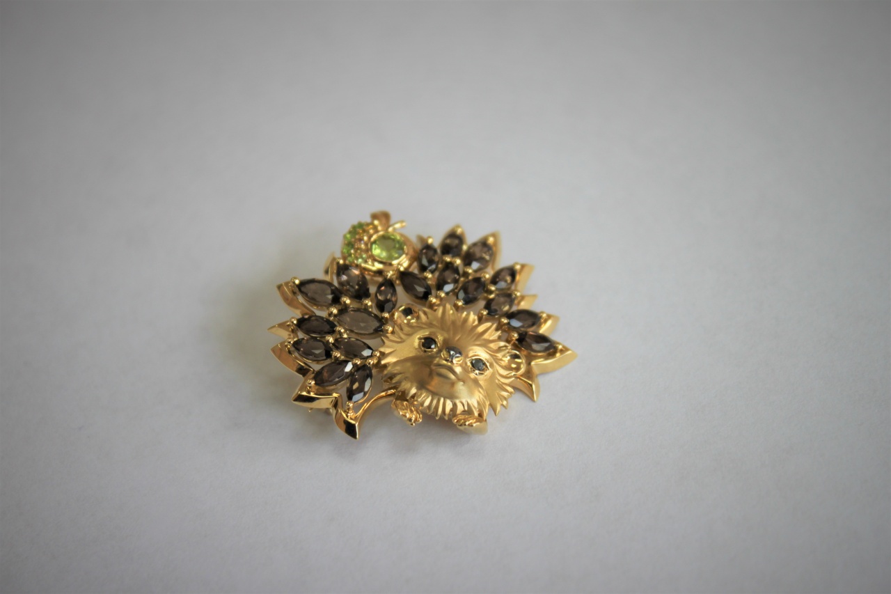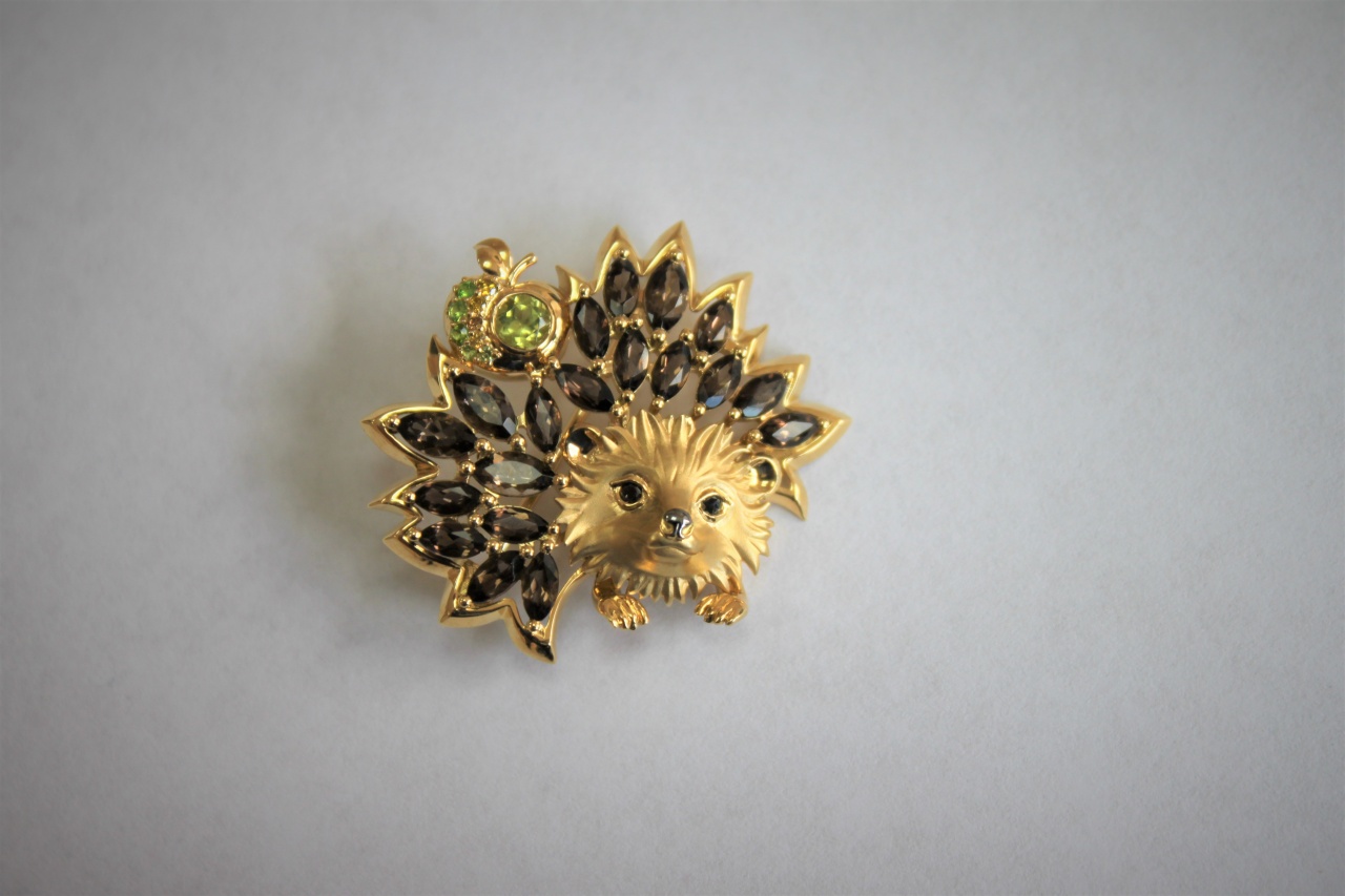 Брошь "Ежик" желтое золото 750 бриллианты-раух топаз-хризолит