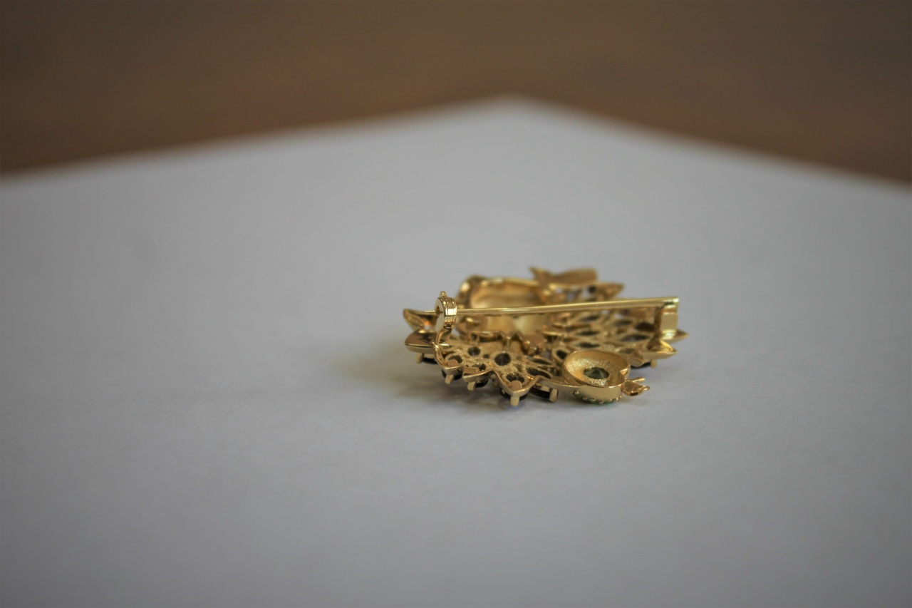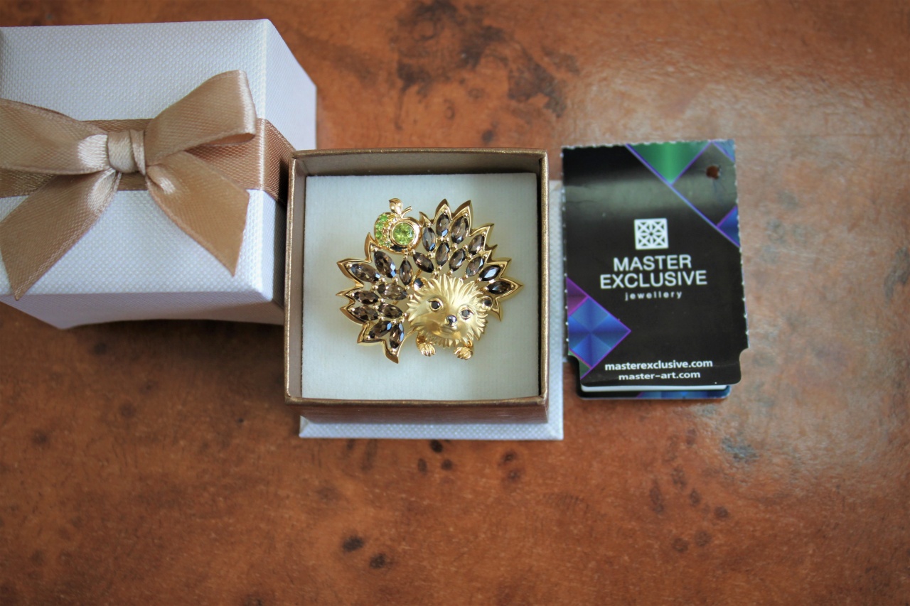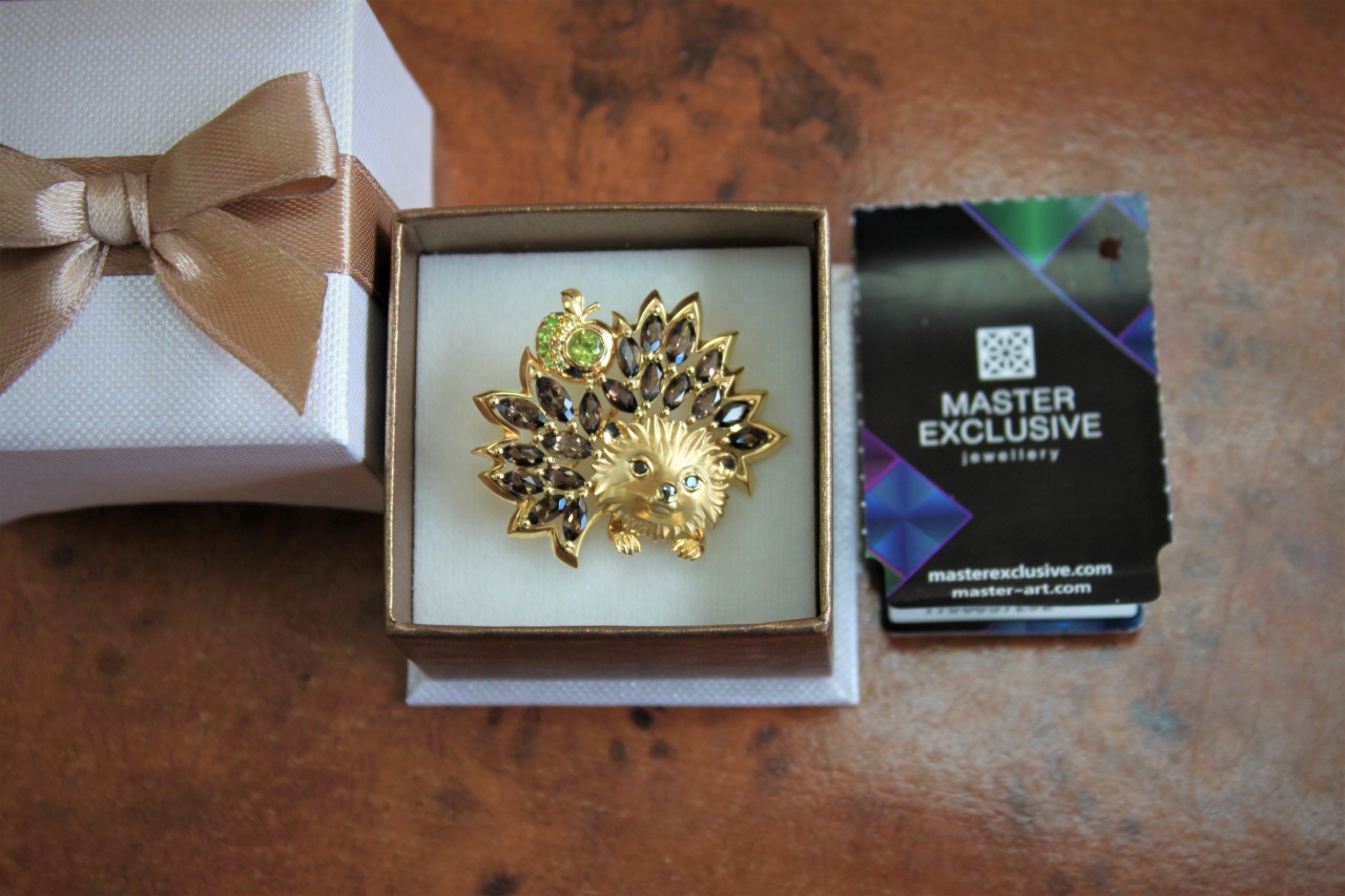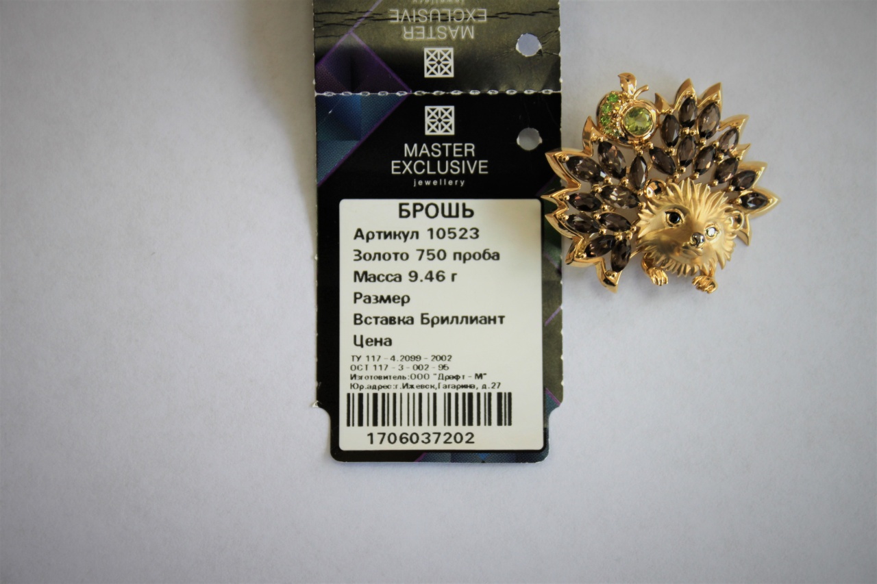 Брошь "Ежик" желтое золото 750 бриллианты-раух топаз-хризолит
