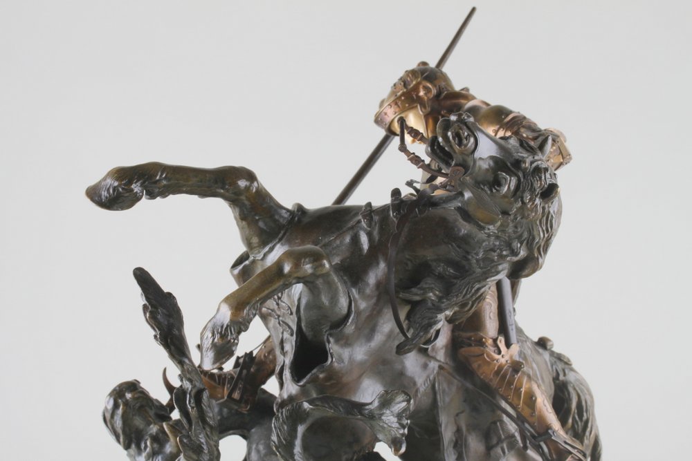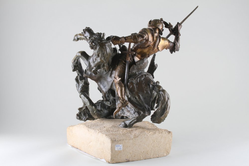 Скульптура представляет яркий и высокохудожественный образец французской бронзы интерьерного значения. Выполнена на высоком художественно-техническом уровне, обладает динамичной, эстетически красивой пластикой, в изготовлении использована полихромная патина и дорогая хрисоэлефантийная техника, предполагающая синтез в одном предмете искусства слоновой кости (лицо Святого Георгия) и металла.