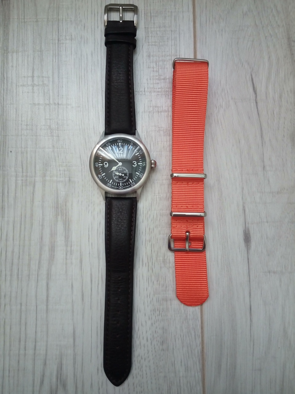 Часы на хорошем кожаном ремне в отличном состоянии, родной оранженый ремень Нато в комплекте, новый. Родной коробки, бумажек нет.