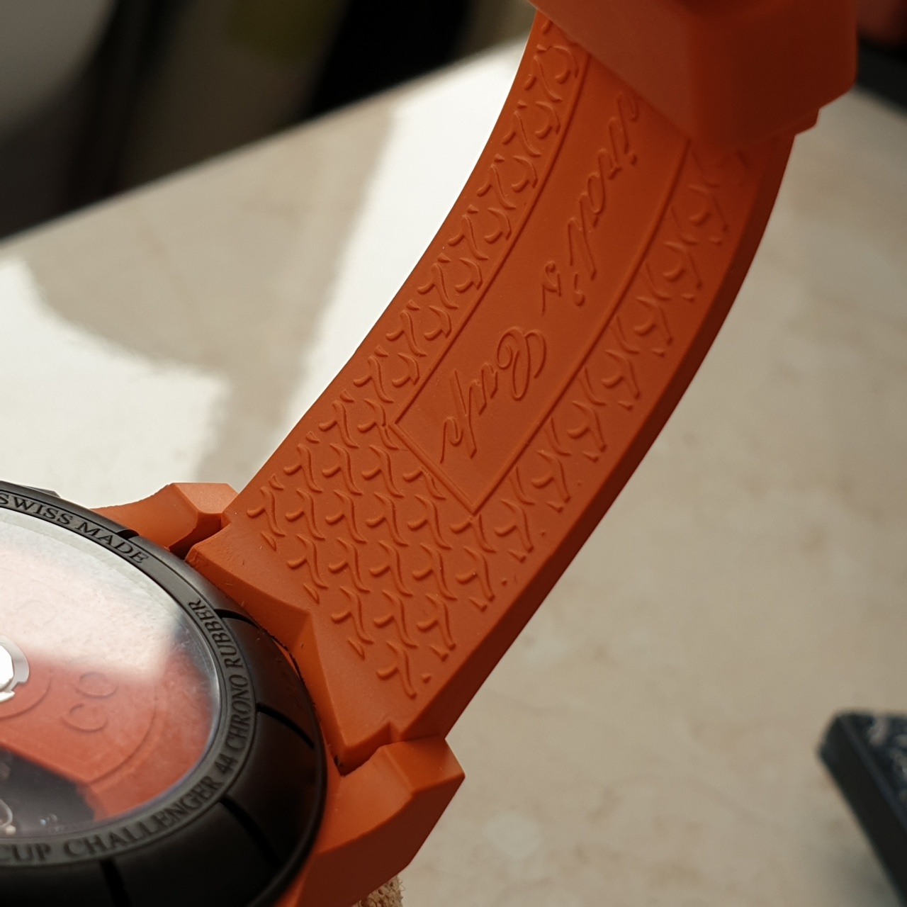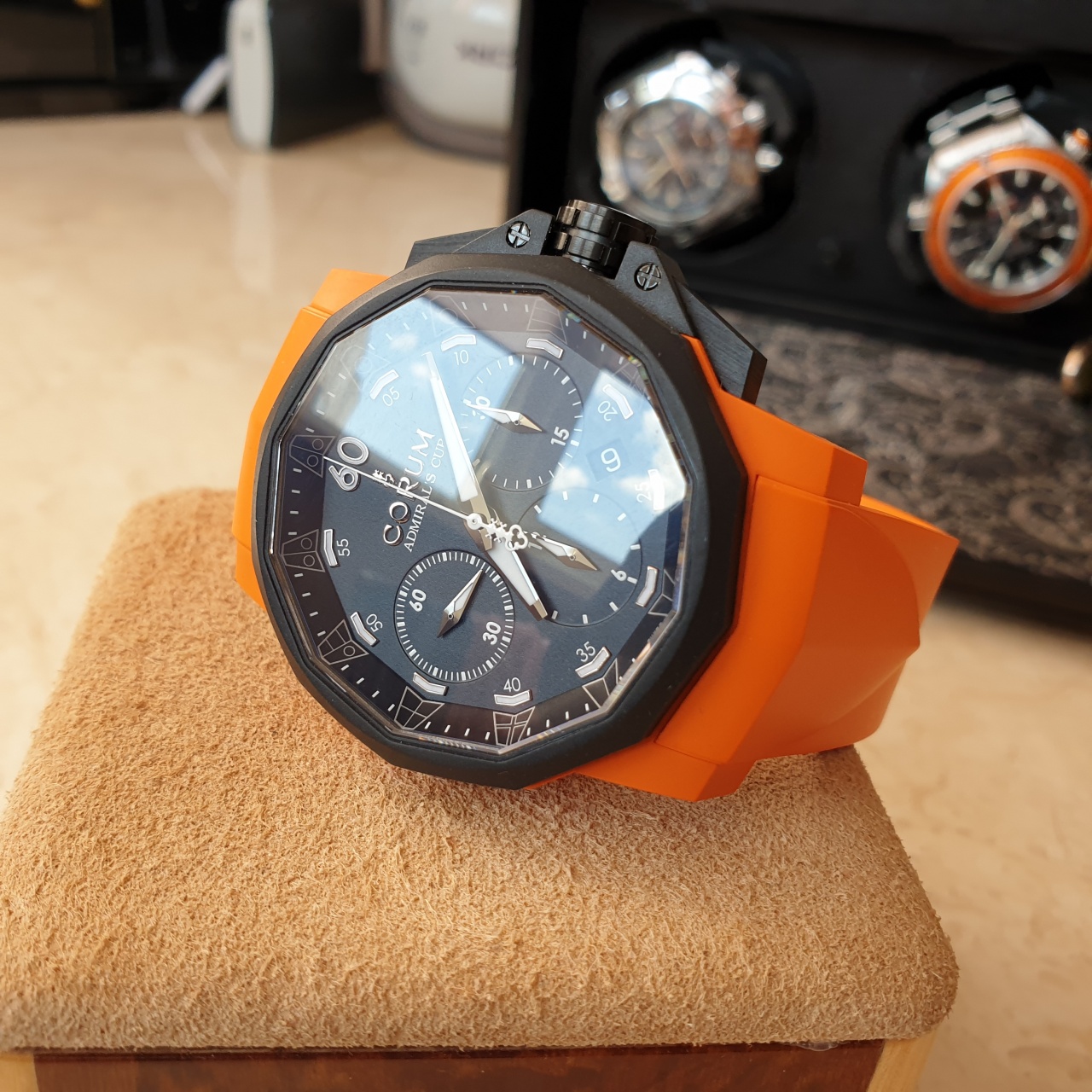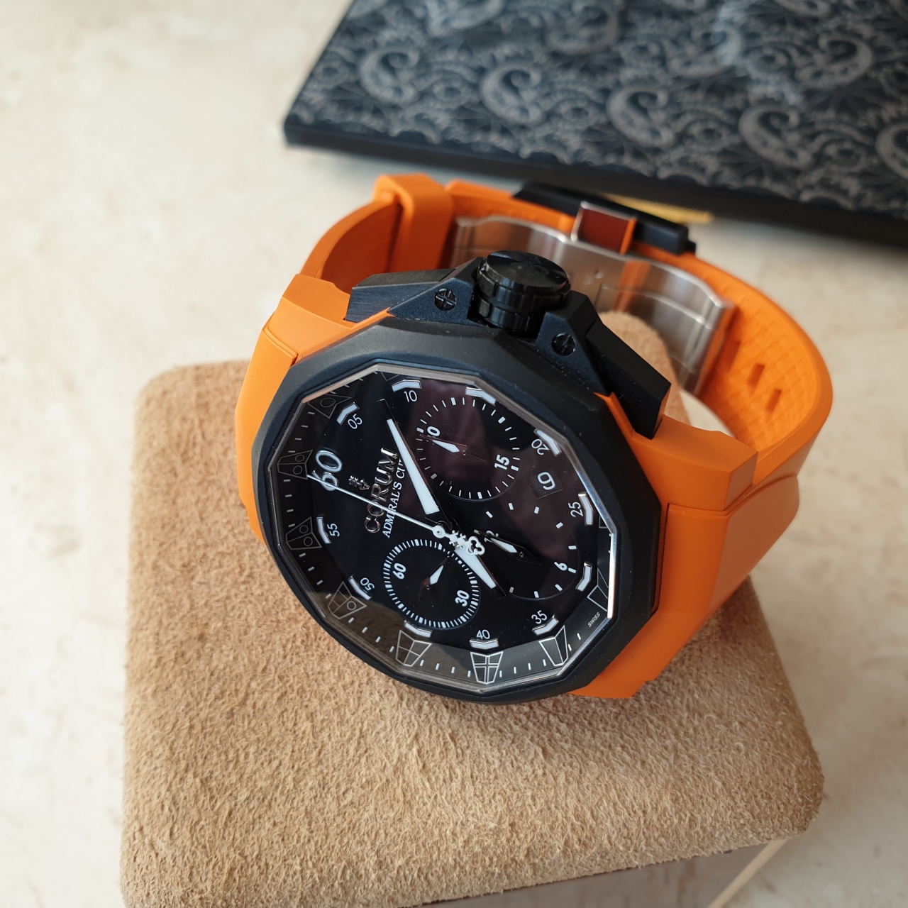 Продолжаем знакомиться с изделиями от всемирно известного швейцарского производителя часов Corum, основанного в 1955 году. Рассмотрим коллекцию, которая называется Admiral`s Cup Challenger. Модель 753.814.02/F374 AN21 это часы, которые подтверждают статус производителя. Двенадцатигранный комбинированный корпус часов из титана с нанесением каучука. Размеры корпуса составляют 44 мм. Основные функции данной модели это часы, минуты, секунды, отображение даты. Данная модель оснащена хронографом и имеет сертификат швейцарской Службы официального контроля за хронометрами (COSC). Черный циферблат с белыми маркерами закрыт под прочным сапфировым стеклом с антибликовым покрытием, благодаря которому не стоит беспокоиться о повреждениях и царапинах. Заводной ключ находится по стандарту на позиции трех часов. Ремешок часов выполнен из каучука с титановой вставкой. Механизм завода - автоматический, оснащён калибром СО 753, запас хода составляет 48 часов. Что касается водонепроницаемости, то она увеличена по сравнению со стандартами, и составляет сто метров. Данная серия была выпущена ограниченным тиражом в количестве 120 шт.