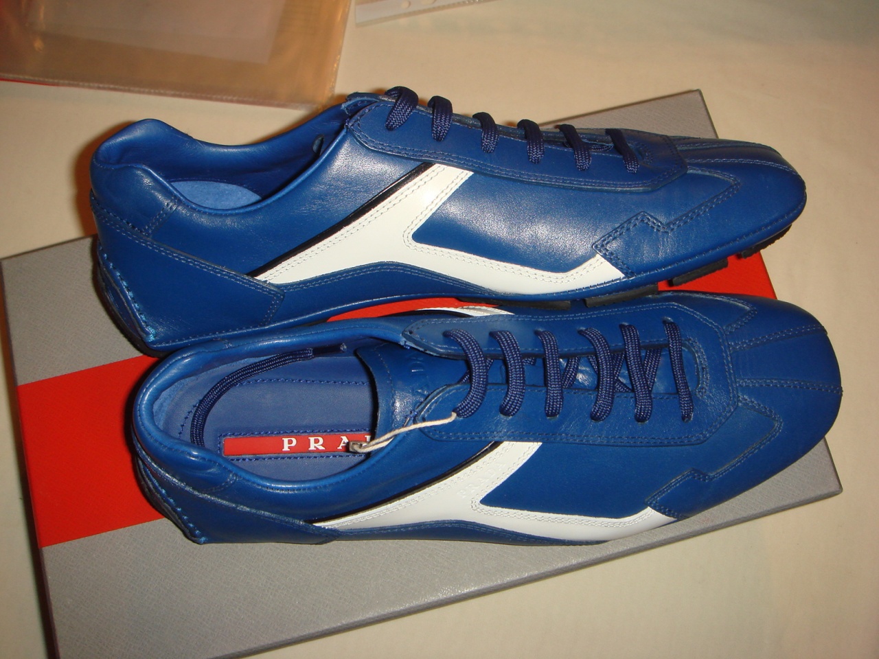 Продаются новые стильные мужские кроссовки мирового бренда PRADA SPORT из телячьей кожи, превосходного исполнения, комбинированного контрастного цвета синий/белый, шнуровка, скругленный носок, верх и внутри 100% телячья кожа, подошва с резиновыми накладками, без каблука, логотип, гарантированный 100% оригинал, размер 40,5 ( 6,5UK) , производство Италия