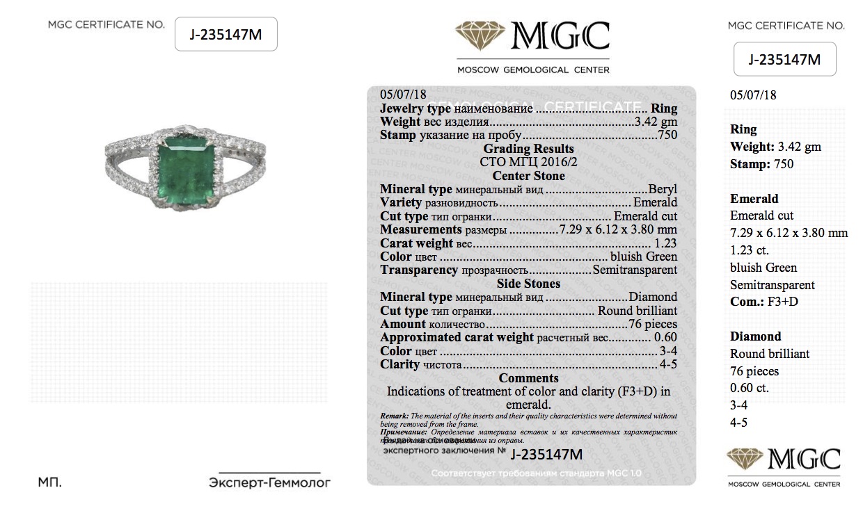 Кольцо из белого золота с изумрудом 1,23 карат и бриллиантами 0,6 карат (сертификат МГЦ)