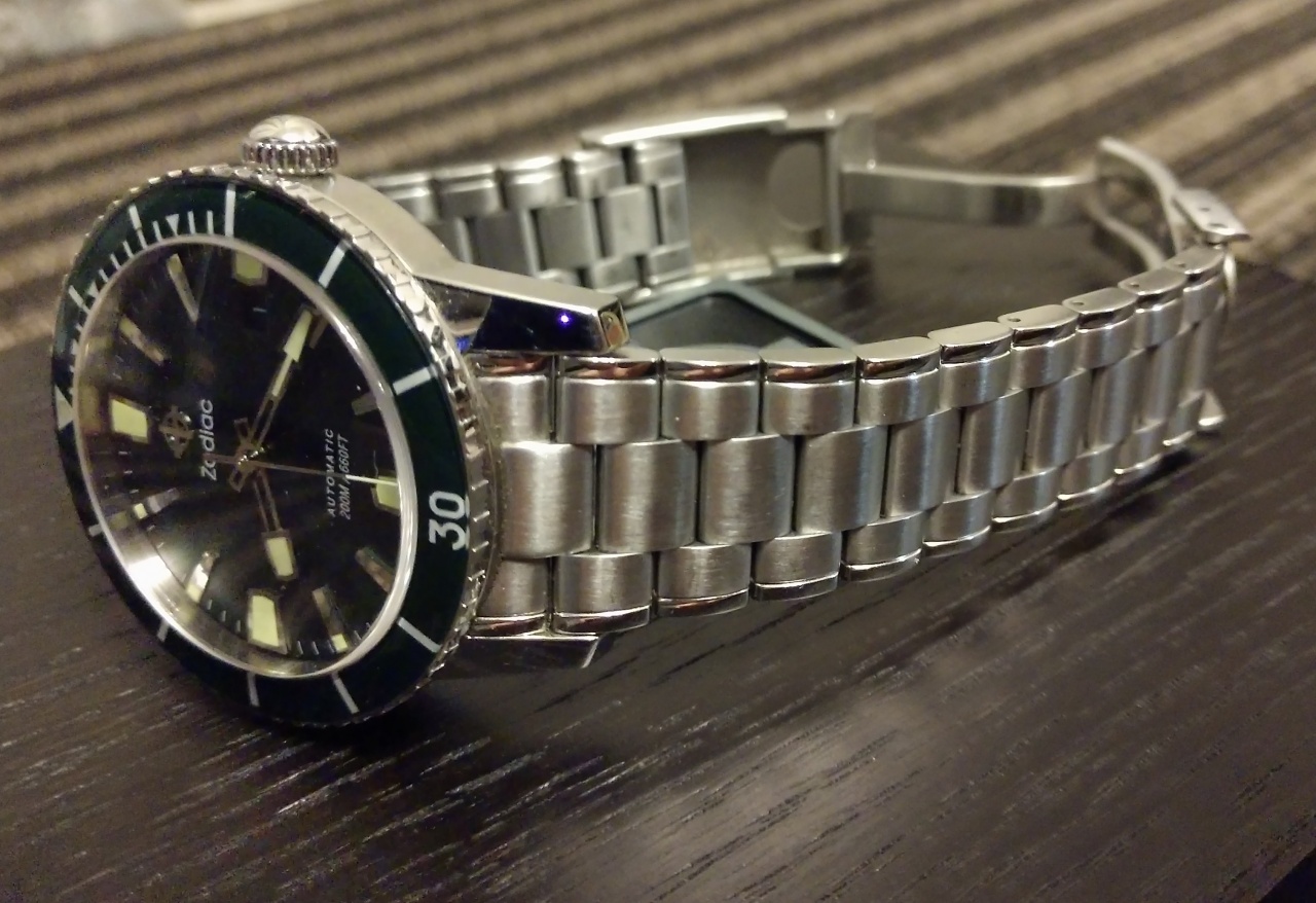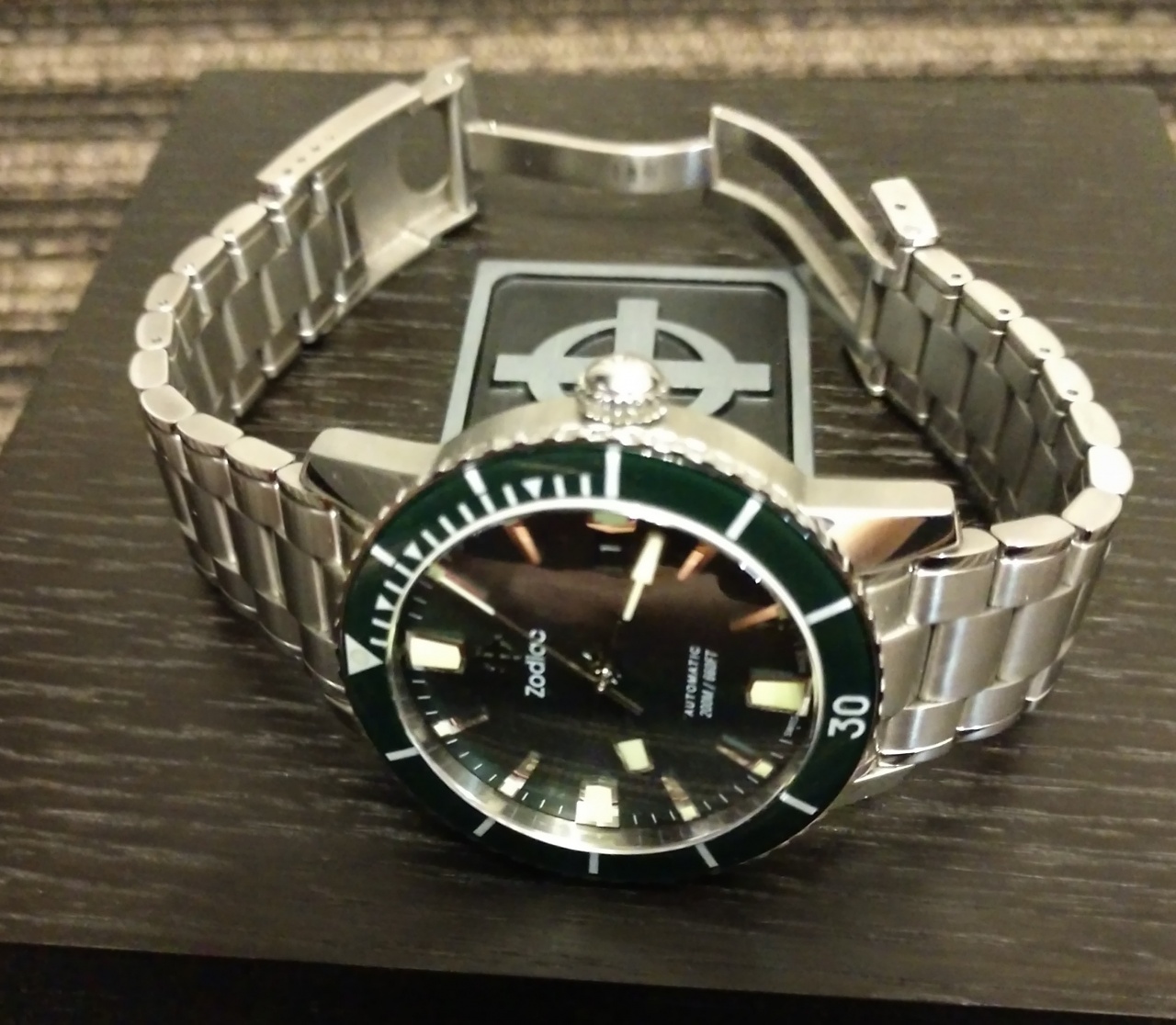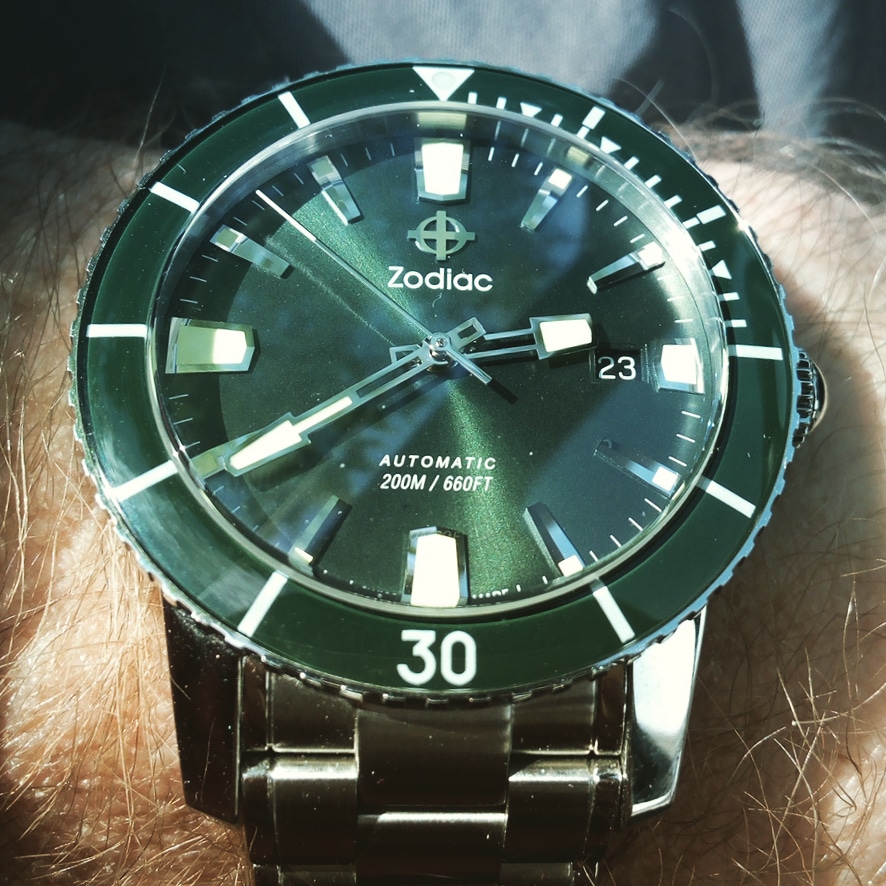 Шикарный зеленый циферблат и безель, которые при размном освещении меняют цвет от изумрудного до почти черного.