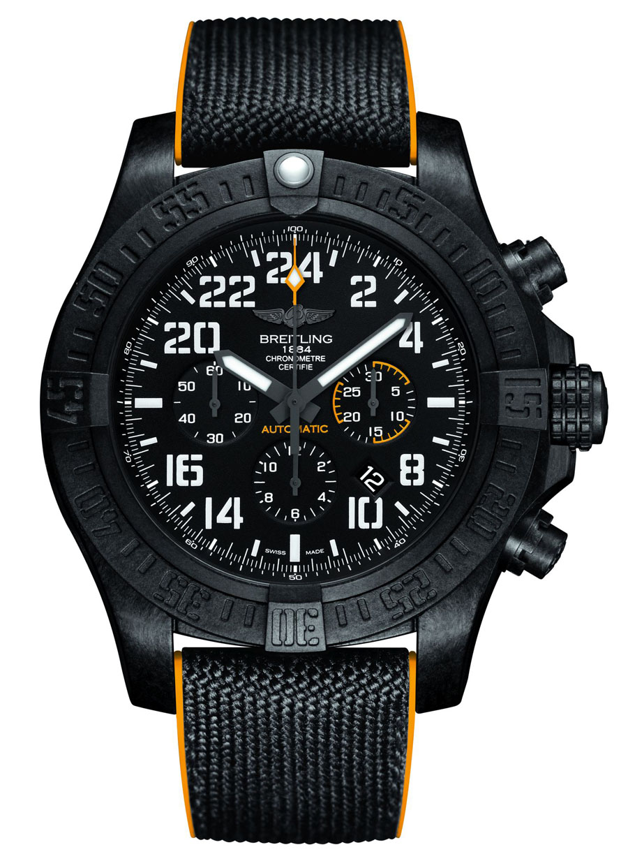 Круглый корпус новинки, изготовленный из Wide Light (материал, специально разработанный для корпуса часов, в 3,3 раза легче титана, устойчивый к образованию царапин, растяжению и коррозии, антимагнитный, термостойкий и гипоаллергенный) черного цвета, диаметром 50,0 мм, водонепроницаемый до 100 метров. На торце завинчивающейся защищенной рифленой заводной головки, расположенной на 3 часах, выгравирован логотип бренда Breitling. Пушеры хронографа размещены на 2 и 4 часах. Вращающийся однонаправленный безель. Сапфировое стекло с двусторонним антибликовым покрытием защищает циферблат матово-черного цвета, с 24-часовой "военной" разметкой. Арабские цифры, часовые индексы, часовая и минутная стрелки покрыты люминесцентным составом белого цвета.