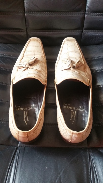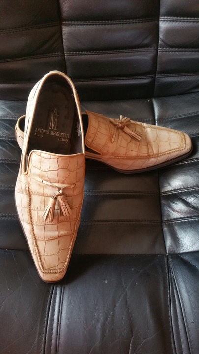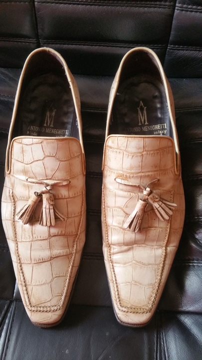 В продаже туфли из кожи крокодила Antonio Meneghetti. Туфли полностью ручная робота, изготовлены в Италии с особым вниманием к мелочам. Туфли полностью кожаные использовались самые лучшие сорта кожи премиальной выделки: крокодила. Внутри полностью отделанные кожей, подошва также кожаная использовалась премиальная заводская профилактика VIBRAM, туфли полностью прошиты. Целевая аудитория Antonio Meneghetti бренда была четко определена - это успешные мужчины, ведущие свой собственный бизнес или покоряющие вершину карьерной лестницы и вынужденные день изо дня соответствовать гардеробом своему высокому положению. За время своего существования Antonio Meneghetti завоевал репутацию Модного дома, специализирующегося на мужской одежде, которая совмещает в себе традиции и современность. Закономерным результатом этого стало создание обуви, отличающейся несравненным комфортом и элегантностью и подтверждающей слоган Дома «Вы не можете быть элегантным, если Ваша обувь неудобна и некрасива».