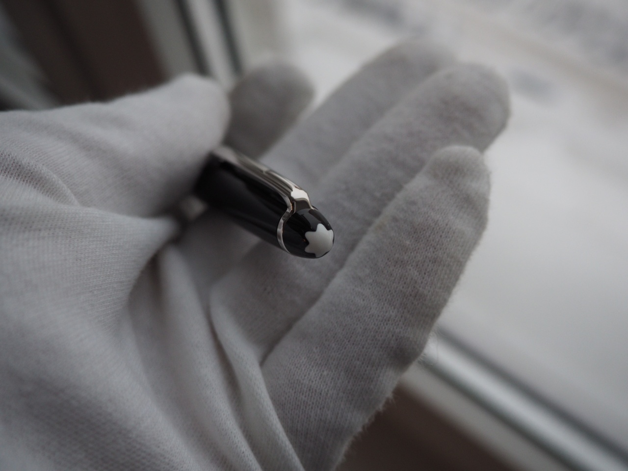 Montblanc. Колпачок и корпус изготовлены из черной драгоценной смолы и украшены вставкой в виде белой эмблемы