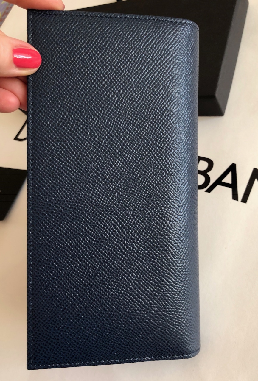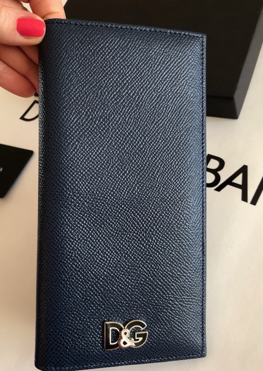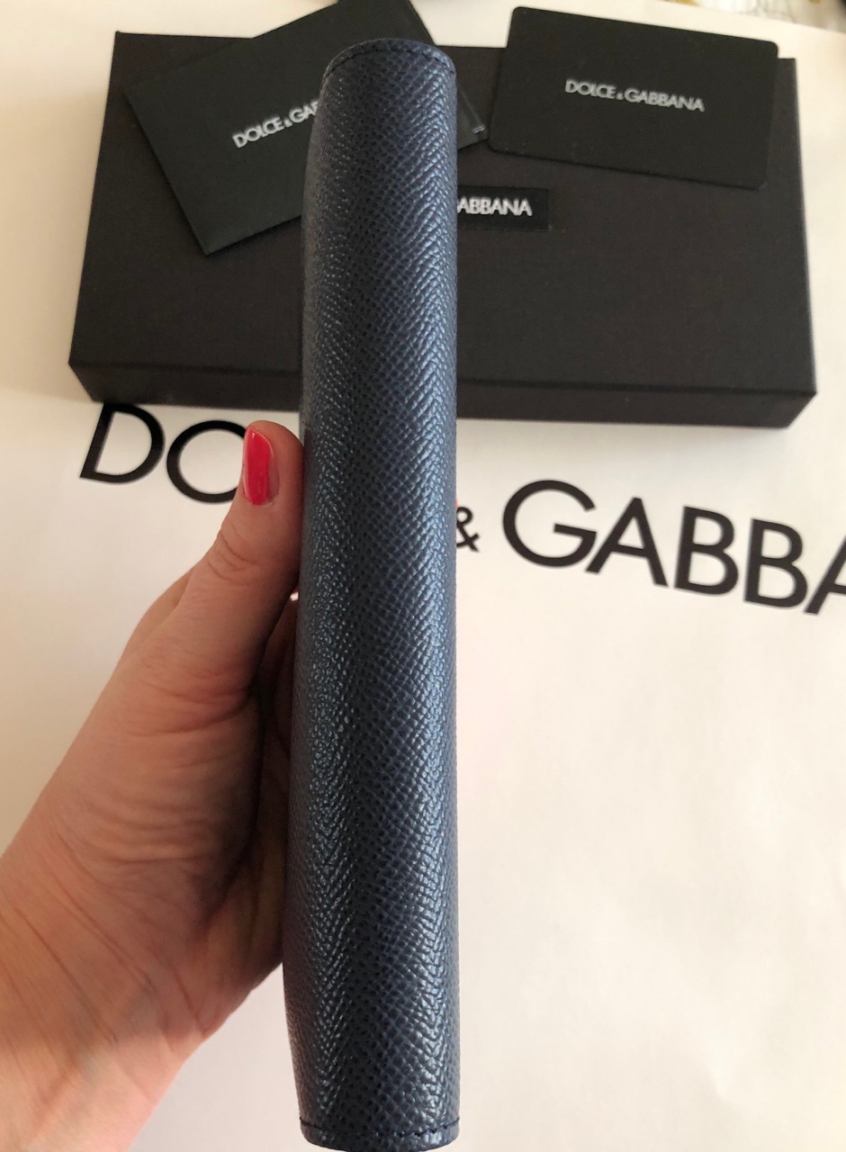 Выполнено из прочной кожи с легким матовым блеском знаменитой выделки Dauphinе (фирменная выделка Dolce), металический лого D&G на передней панели. Двуцветное: снаружи темно-синий глубокий оттенок, внутри - черное, сочетание смотрится очень стильно. Удобная скрытая магнитная застежка на углах, отлично держит и удобна в использовании. Стильный и яркий дизайн для современного делового мужчины.