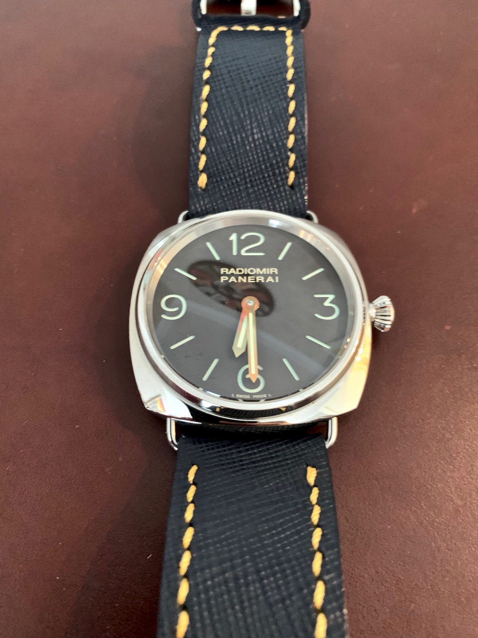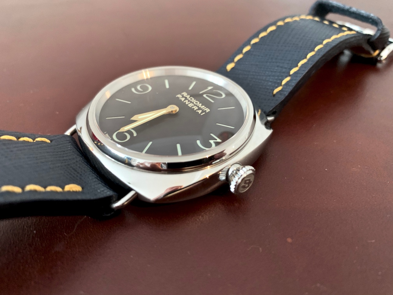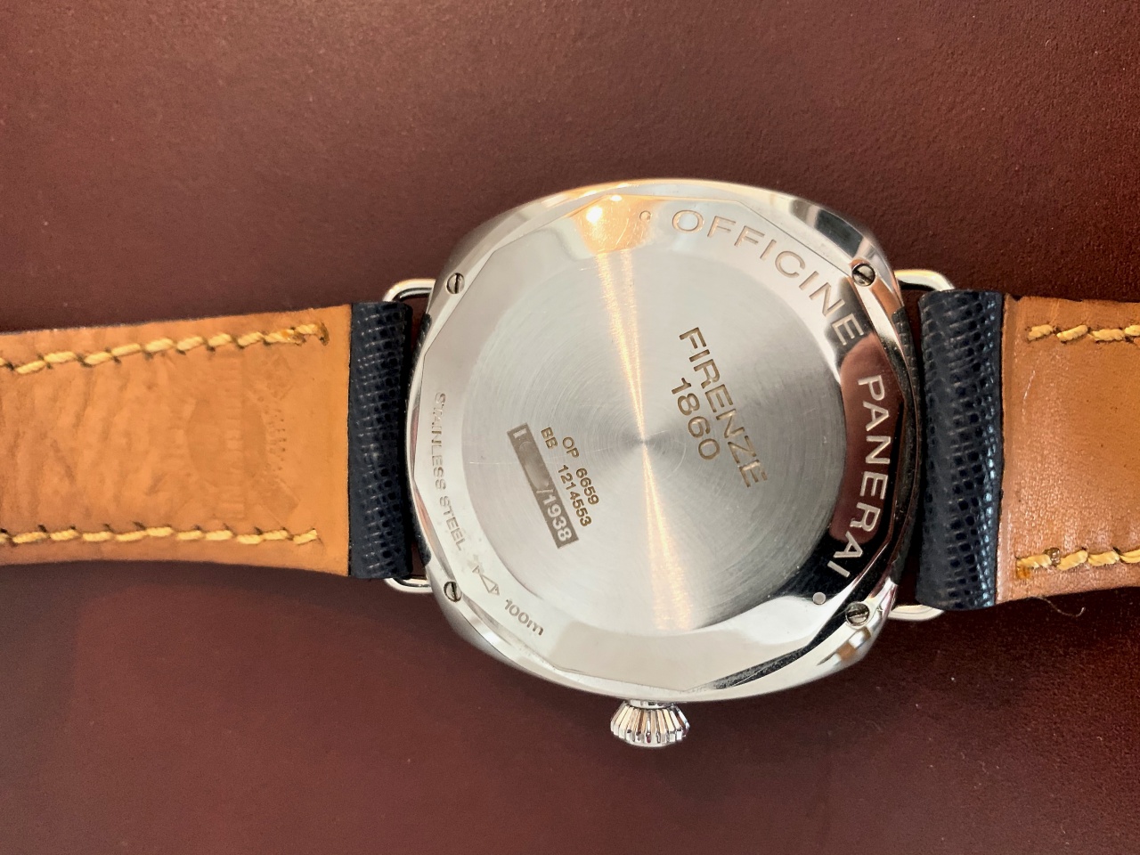 Strap: Panerai personalised leather strap and steel sewn-in buckle.