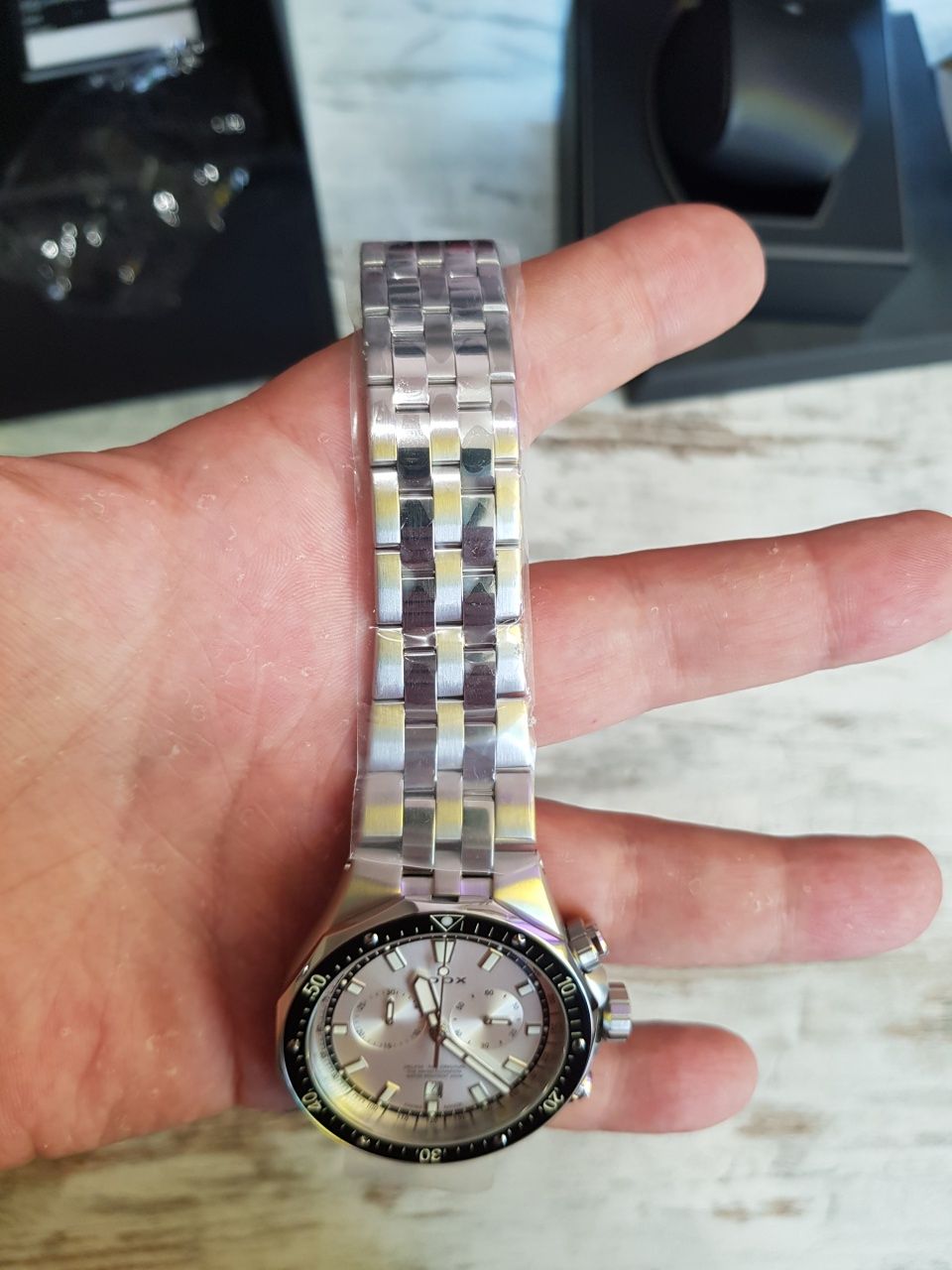 Часы были в пленках. Одеты один раз на торжественное мероприятие (не удержался). Никаких следов ношения. Снято одно звено с браслета.