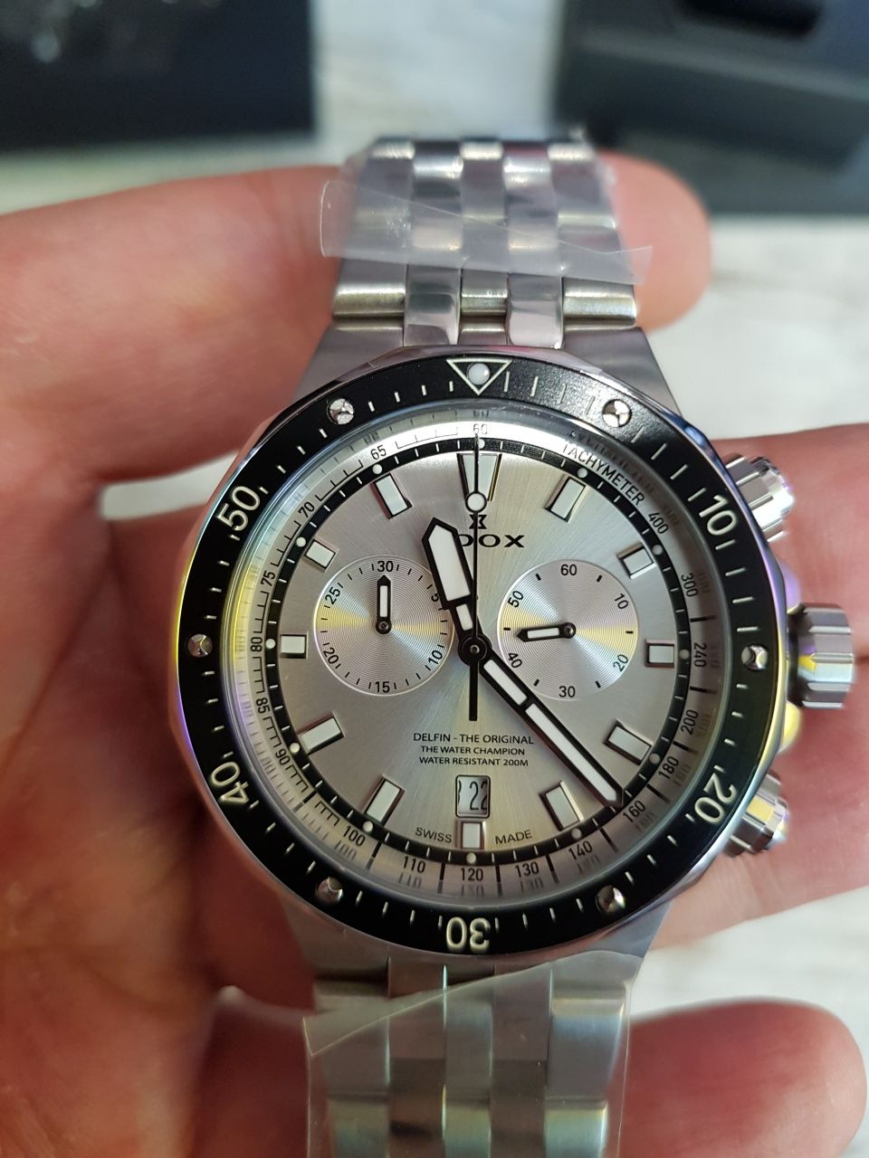 На мой взгляд один из лучших и универсальных дельфинов из всей линейки. Не скучный серебристый циферблат, красиво переливается на солнце. Достойный люм на стрелках и метках. Идеальная читаемость времени, интересное сочетание черного безеля, матовой и полированной стали. Сплит-хронограф. Вращающийся безель. Заводная головка с защитой. Завинчивающаяся задняя крышка. Заводная головка и кнопки управления хронографом с двойной прокладкой для герметичности. Браслет с раскладывающейся застежкой. Застежка с системой блокировки. Очень достойное качество отделки. На руке этот дельфин смотрится дорого и благородно. Без всяких "натяжек" смелый универсал, под любой стиль. Идеален для повседневной носки. Все перечисленные преимущества однозначно подчеркнут вкус и стиль владельца, и без сомнения заставят окружающих заглядываться на Ваше запястье.