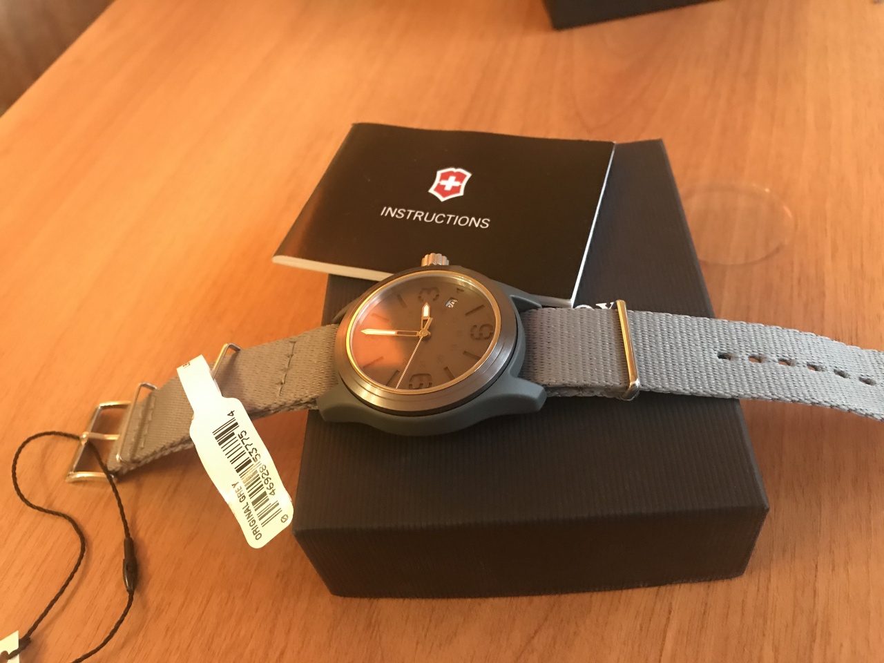 Крутые серые Викториноксы в милитари стиле. Корпус 40 мм серый пластик очень твёрдый, крышка сталь на резьбе, Водозащита 100 м, безель серый алюминий, стекло минеральное, механизм кварц, люм на стрелках очень качественный с хорошим долгим светом, циферблат как у пам с эффектом сэндвич. Цифры и метки вдавлены и циферблат имеет красивую рельефную фактуру. Ремень нато серый, шелковистый на ощупь. Хорошо читаемая дата. Заводная головка с эмблемой не резьбовая. В целом часы производят хорошее впечатление, лёгкие , удобные на руке, оригинальные. Выглядят дороже чем стоят. Прайс 20 тысяч рублей, у меня гораздо дешевле.