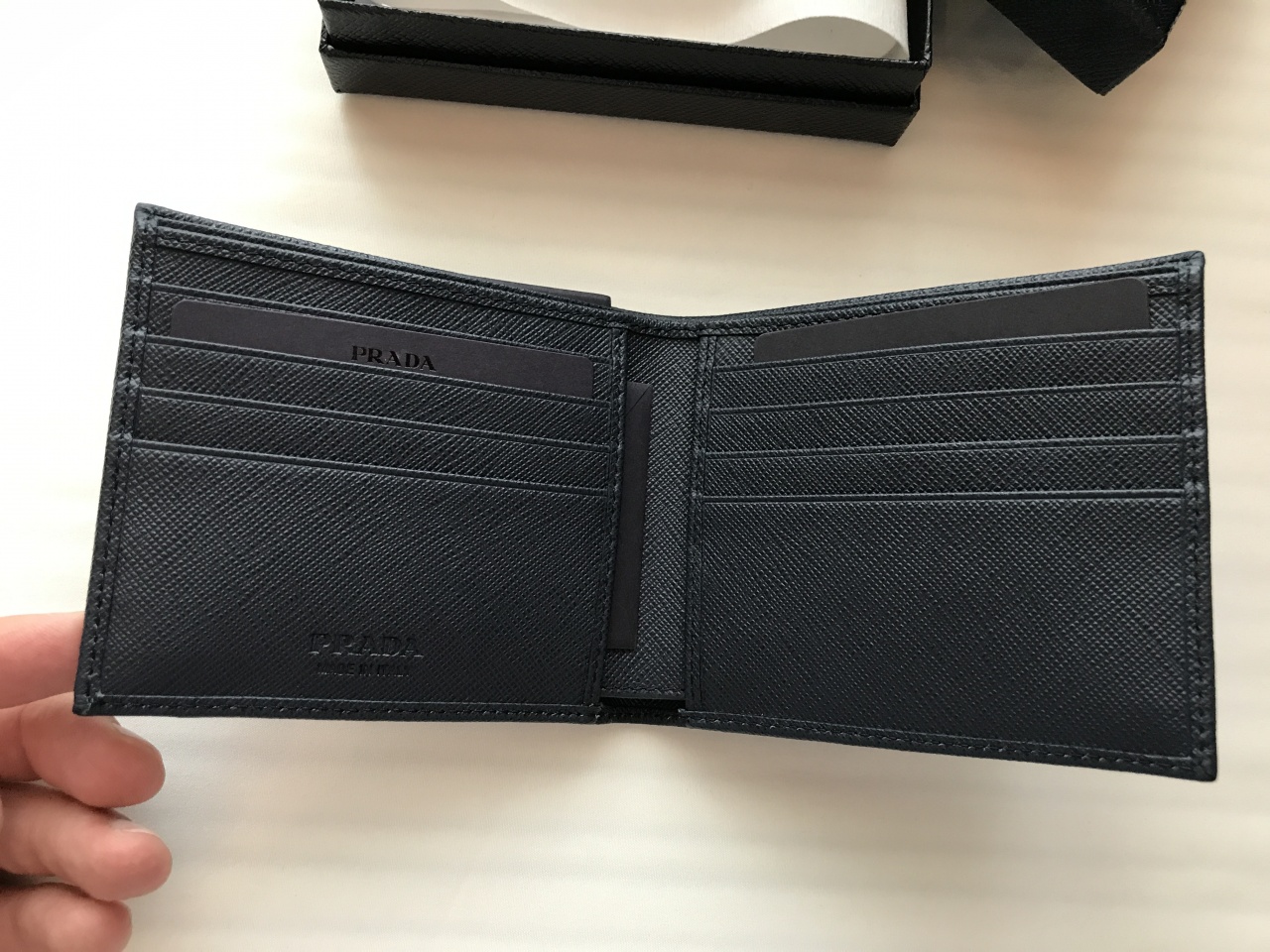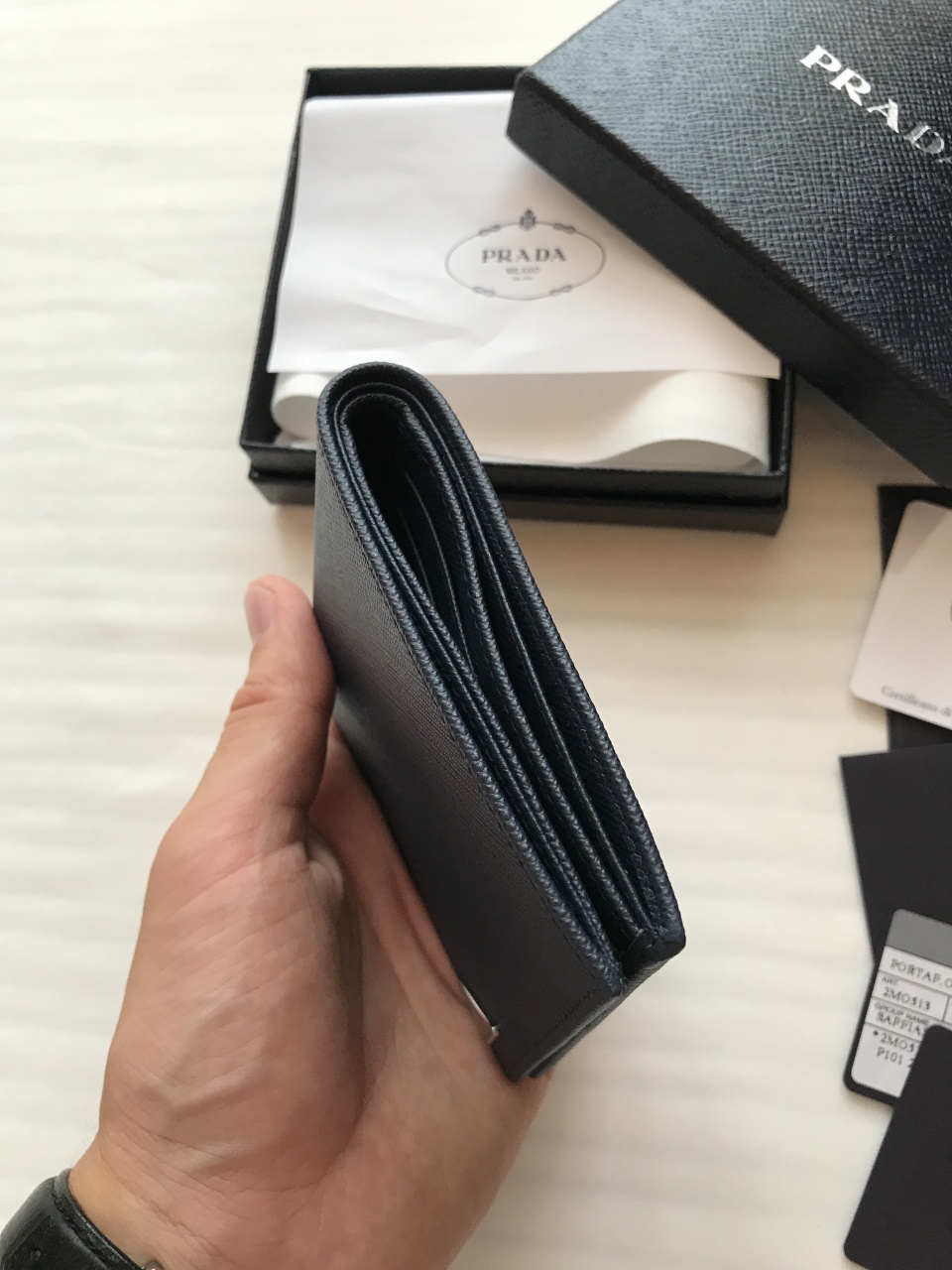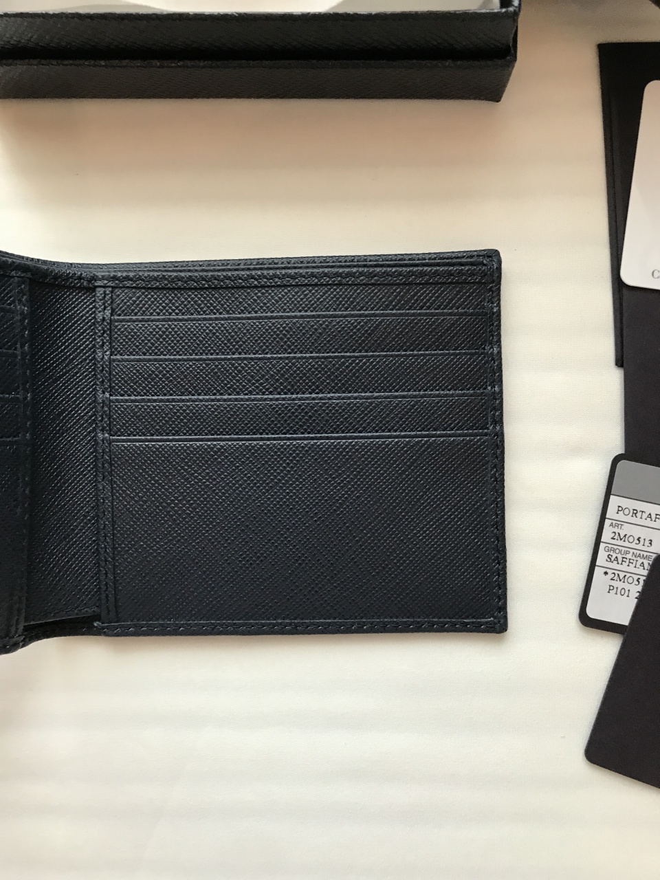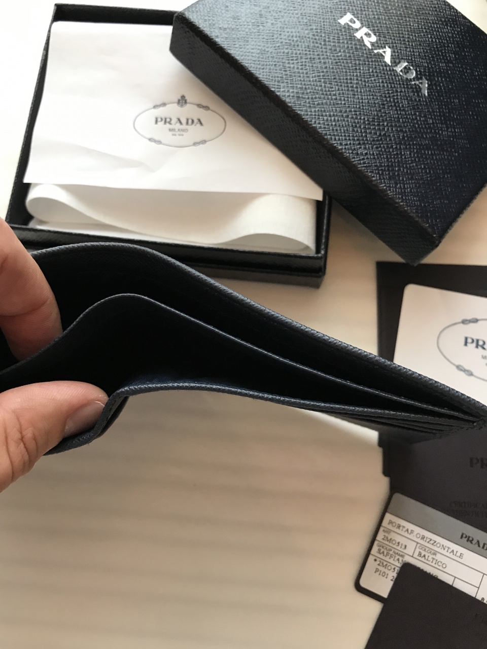 Удобный компактный карманный формат - размеры 9,5 на 11 см. Легендарная кожа Saffiano, на передней панели треугольный металический патч с лого PRADA Milano и гербом, внутри кожа Saffiano с тиснением лого PRADA made in ITALY. Цвет темно-синий (Baltico), очень хорошо смотрится, легко сочетается с одеждой и другими аксессуарами. На стенке левого бокового отделения секретный тисненый код.