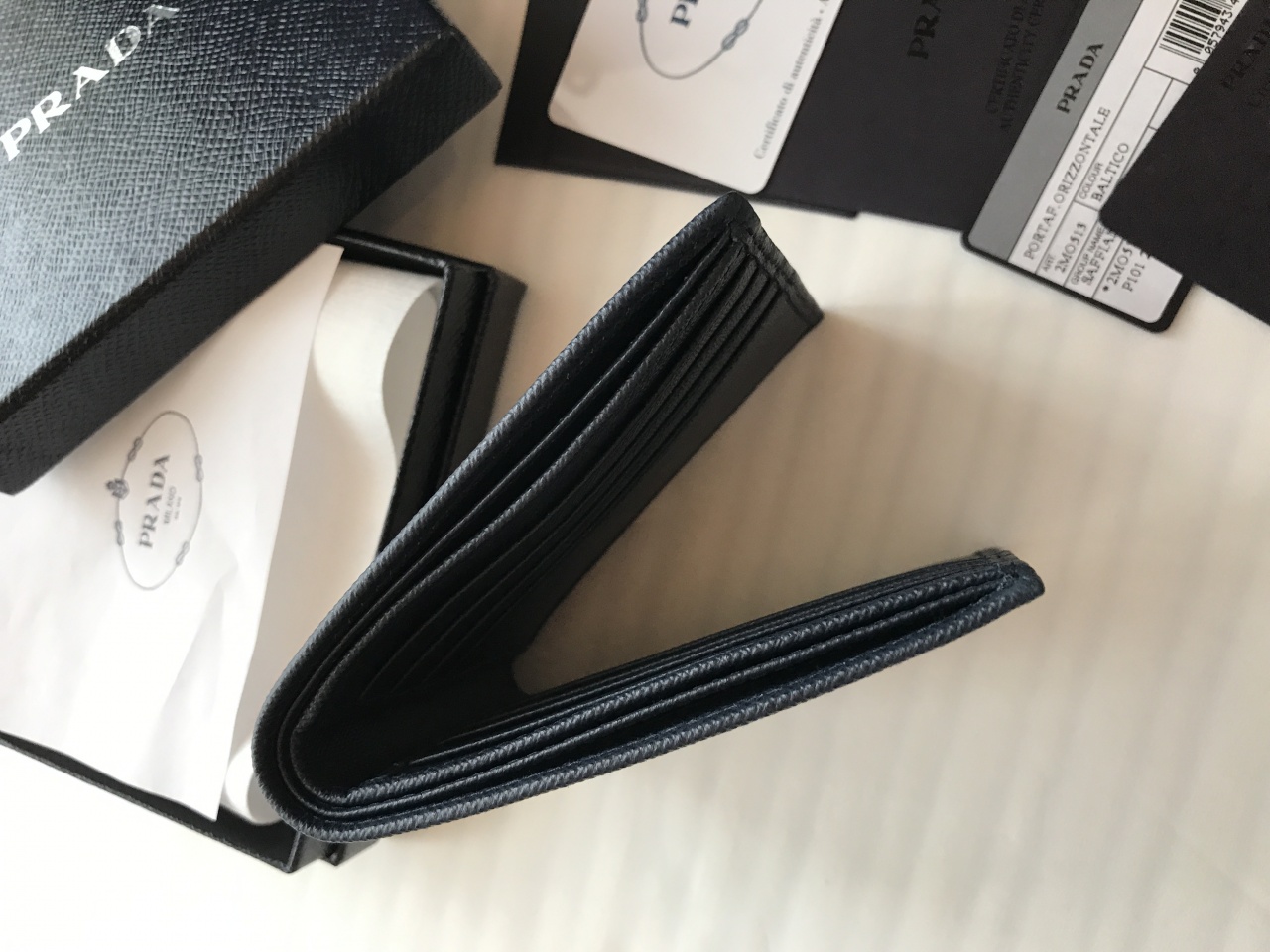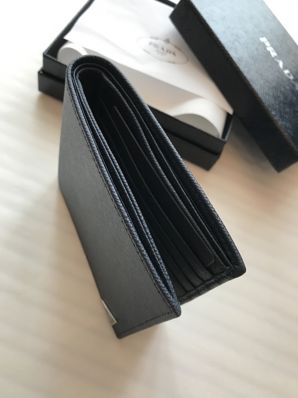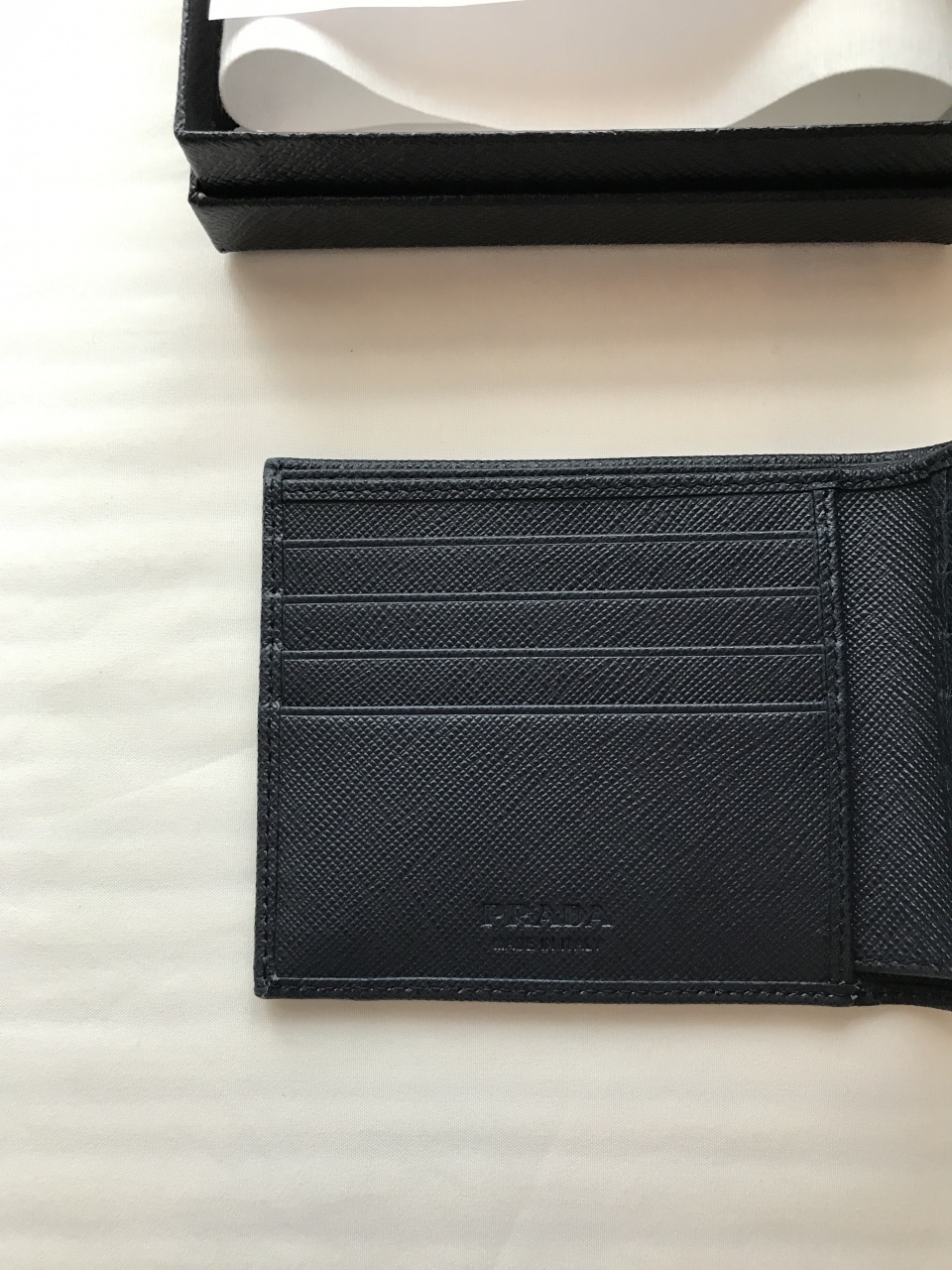 Удобный компактный карманный формат - размеры 9,5 на 11 см. Легендарная кожа Saffiano, на передней панели треугольный металический патч с лого PRADA Milano и гербом, внутри кожа Saffiano с тиснением лого PRADA made in ITALY. Цвет темно-синий (Baltico), очень хорошо смотрится, легко сочетается с одеждой и другими аксессуарами. На стенке левого бокового отделения секретный тисненый код.