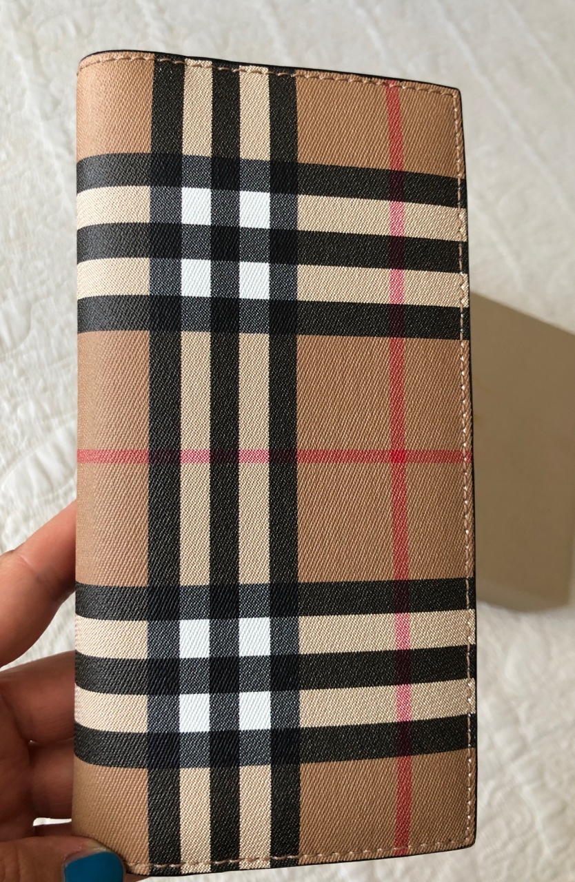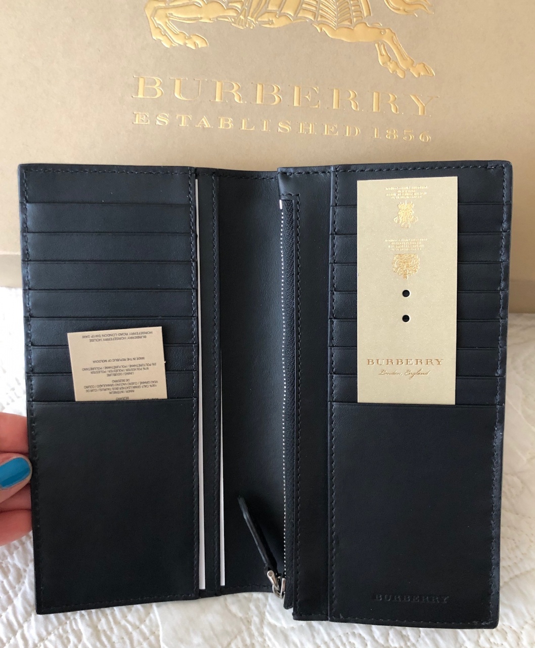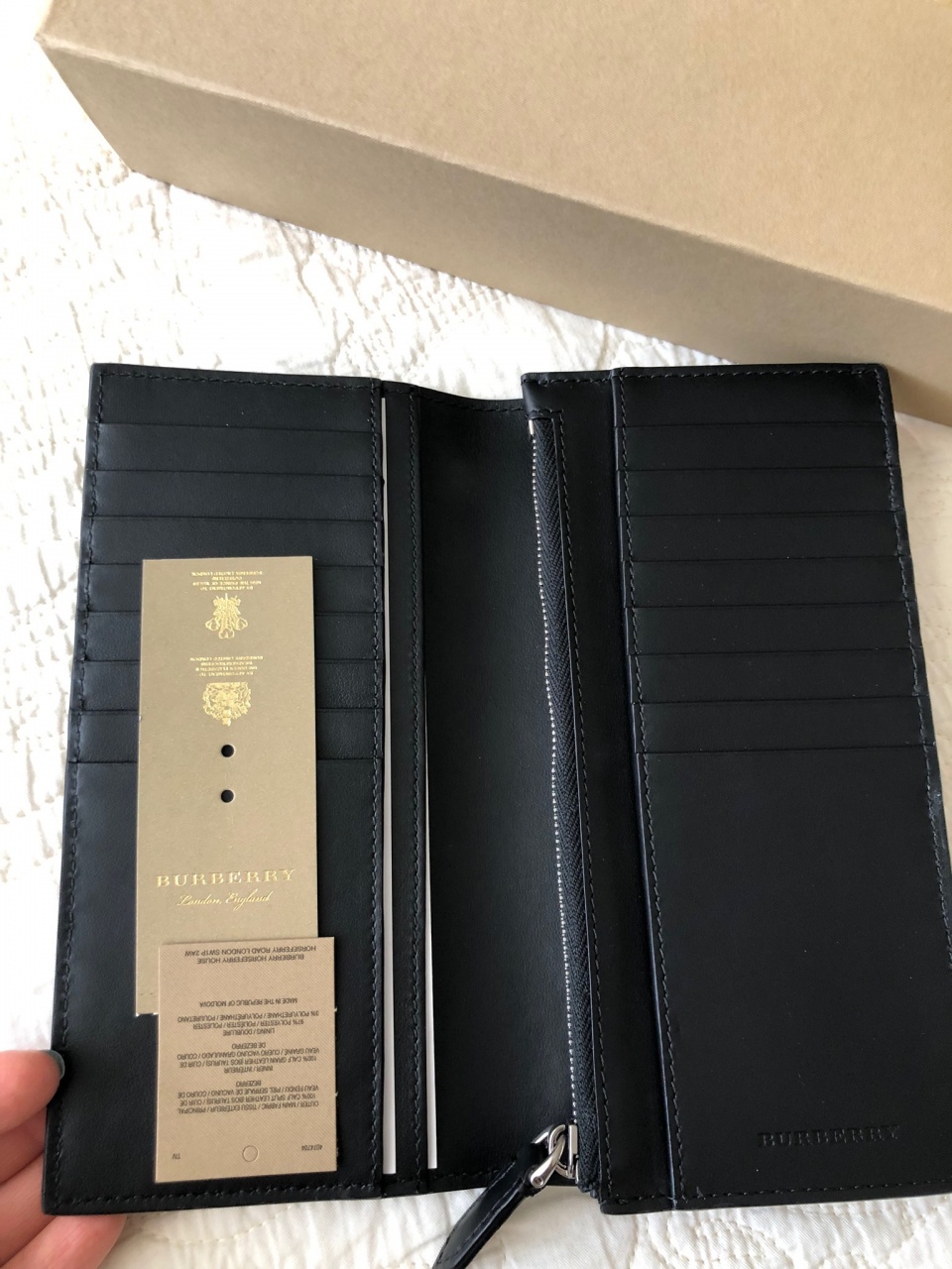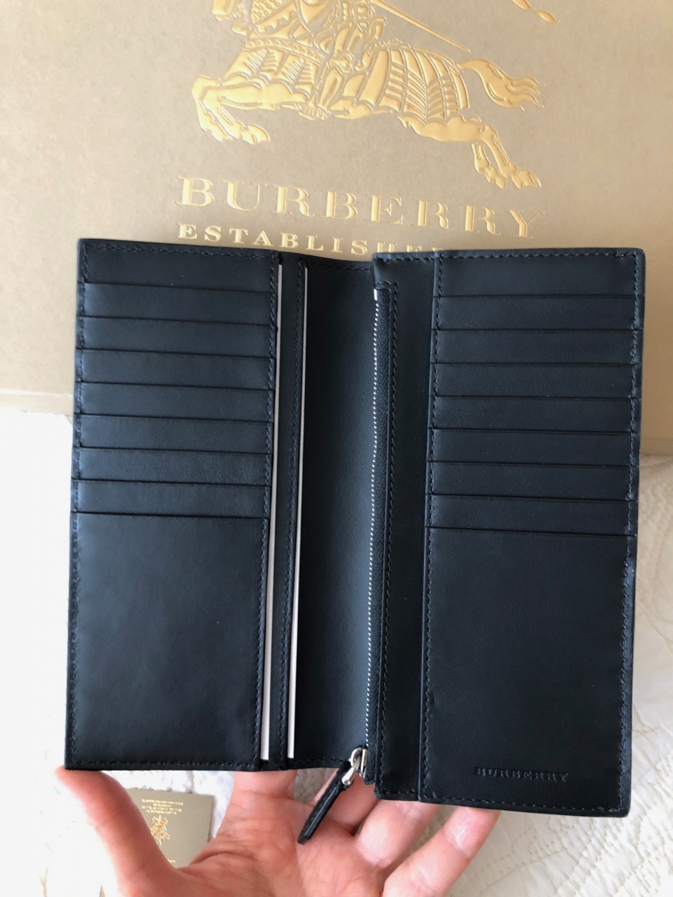 Удобный формат, отлично во внутренний карман пиджака или куртки, размер - 10 на 19 см. Внутри 1 широкое и 3 узких продольных отдела для купюр и документов, 16 слотов для кредиток\визиток, отделение на молнии. Тиснение бренда внутри на коже, инд номер изделия, кожаный зиппер нового формата (появился у Burberry в 2019 г). Внешняя отделка - канвас с пропиткой, слегка блестящий на свету, знаковая яркая клетка, верхние и внутренние панели - черная матовая кожа.
