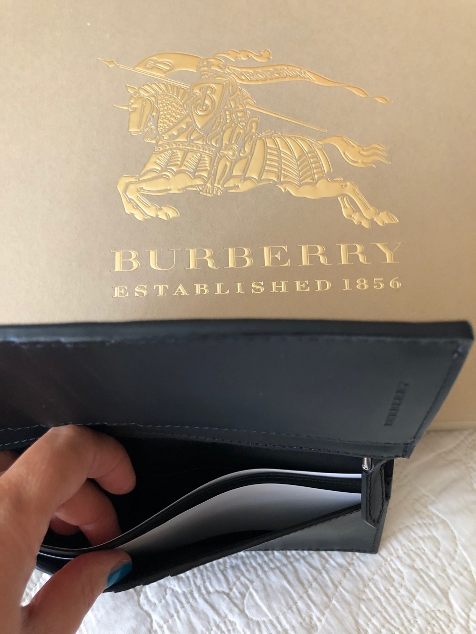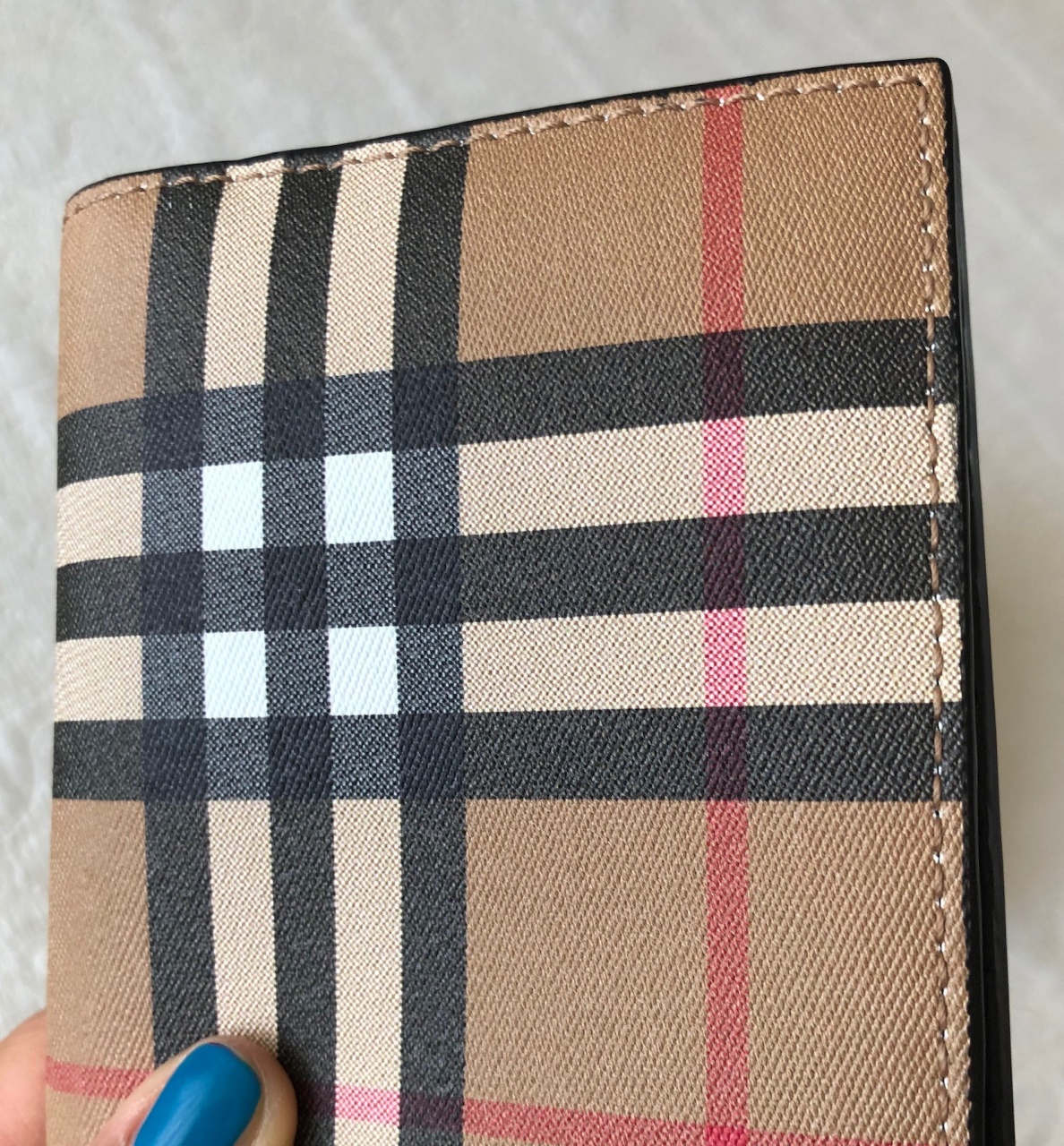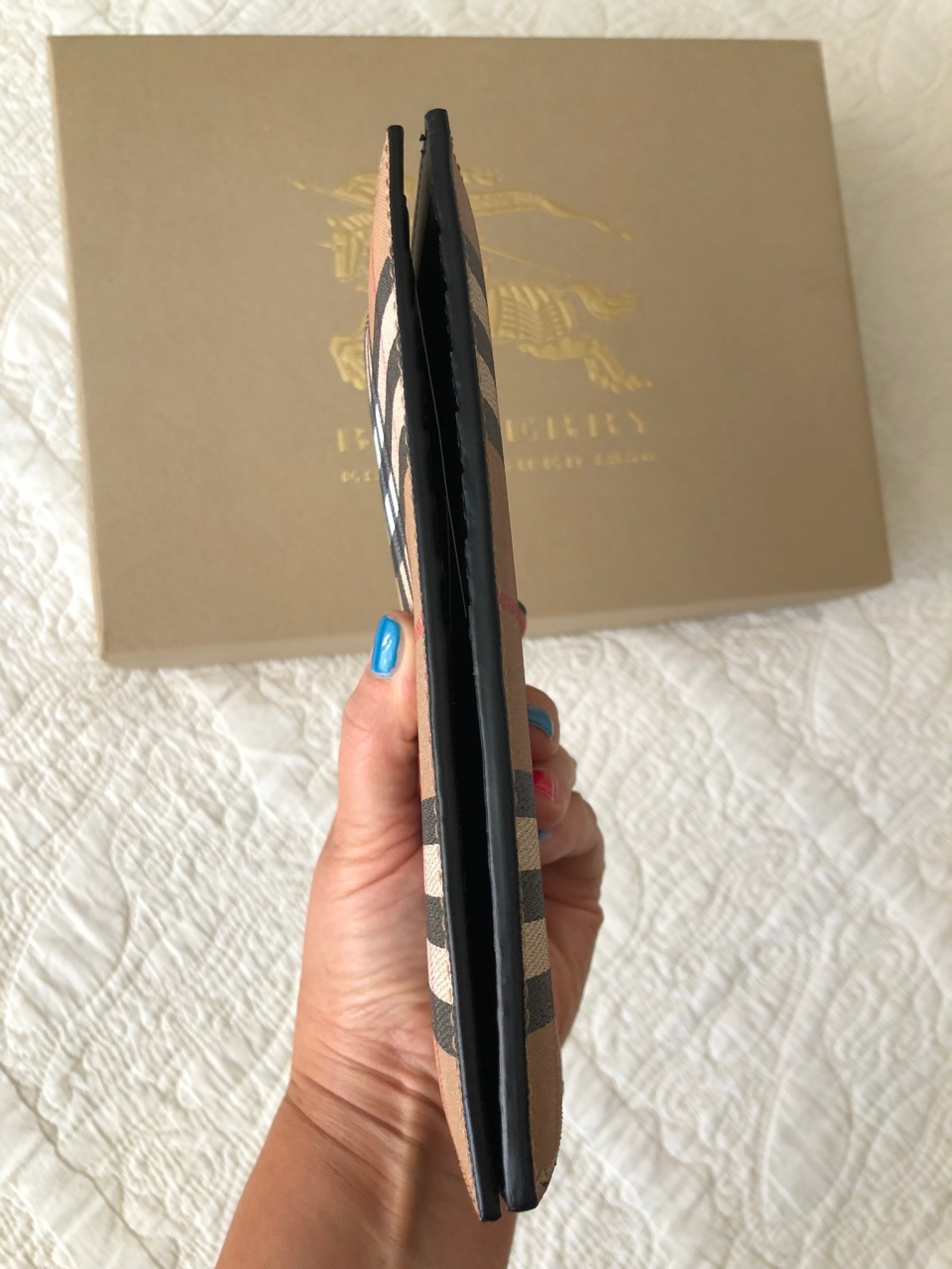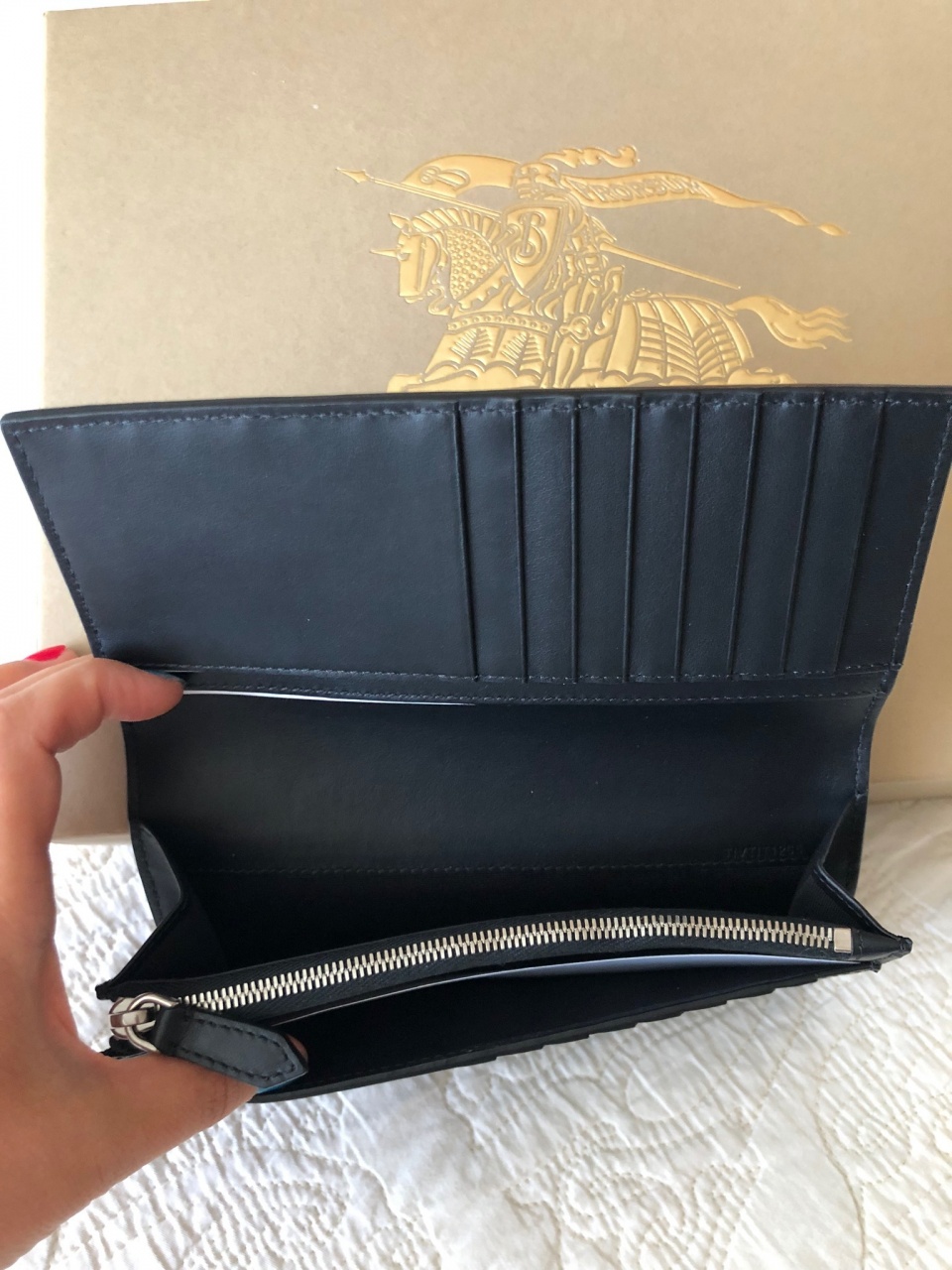 Удобный формат, отлично во внутренний карман пиджака или куртки, размер - 10 на 19 см. Внутри 1 широкое и 3 узких продольных отдела для купюр и документов, 16 слотов для кредиток\визиток, отделение на молнии. Тиснение бренда внутри на коже, инд номер изделия, кожаный зиппер нового формата (появился у Burberry в 2019 г). Внешняя отделка - канвас с пропиткой, слегка блестящий на свету, знаковая яркая клетка, верхние и внутренние панели - черная матовая кожа.