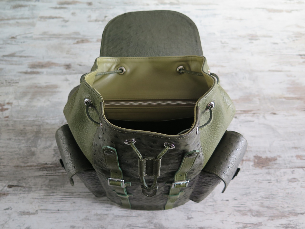 Рюкзак изготовлен из кожи страуса высочайшего качества выделки, аналогичной коже используемой в изделиях Дома моды Hermes Paris, со вставками из буйволиной кожи.