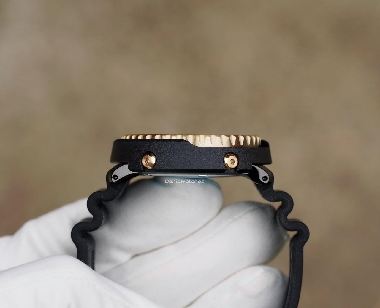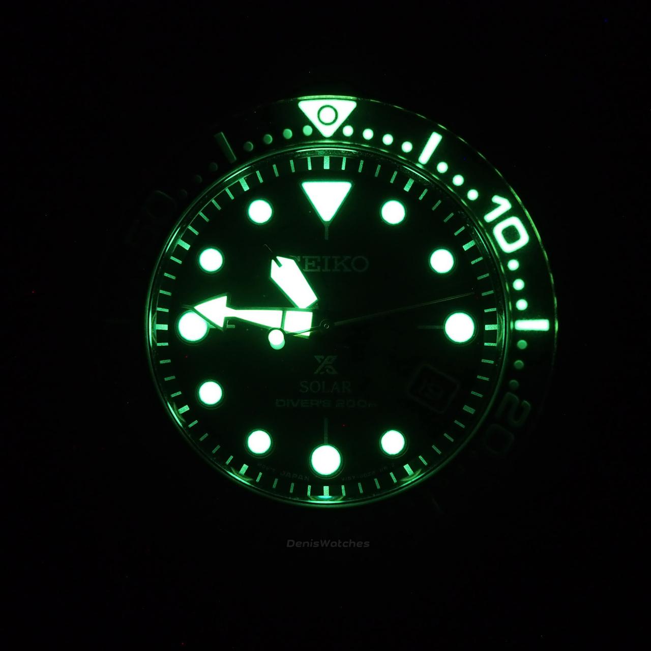 Люминесцентные стрелки и метки - фирменная светомасса LumiBrite, светит очень ярко, цвет зеленый, так же светится разметка безеля от 0 до 20