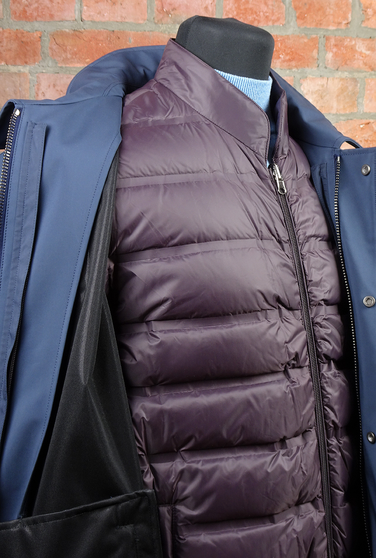 Внутри к плащу пристегивается куртка. Куртка - полноценный пуховик (натуральный утеплитель: 90% пух, 10% перо). У куртки два внешних кармана и два кармана внутри (обычный и на молнии).