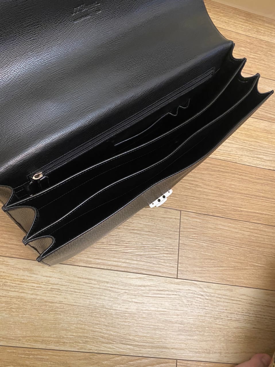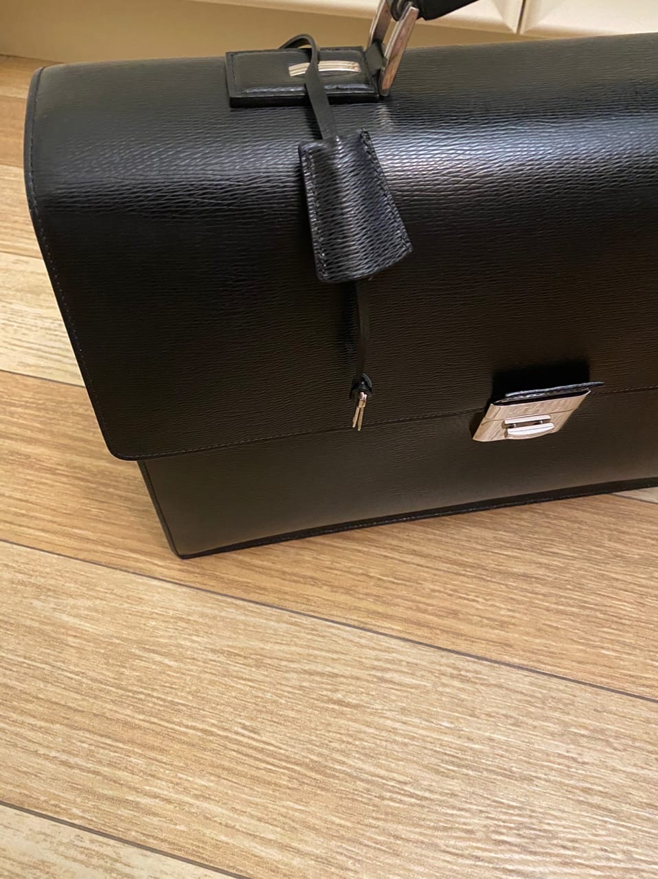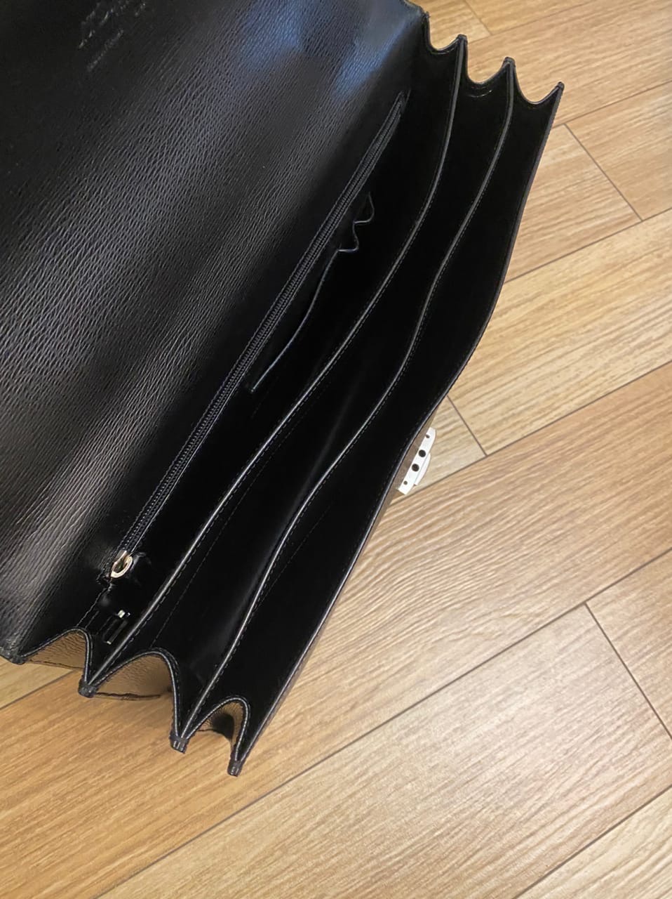 Самый дорогой и вместительный портфель с 3 отделениями из серии Contraste. Выполнен полностью из яловичной кожи. Цвет черный. Отделка кожи "double godron" в виде двух рельефных полос. Замок из накладной латуни и палладия (1 микрон). Снаружи: 1 накладной задний карман во всю длину портфеля, с помещенным внутрь накладным карманом для авиабилетов. Внутри: 3 отделения и 1/2 отделения,1 карман на молнии во всю длину,1 кармашек для кредитных карт, 2 петли для ручек,1 открытый карман для ключницы или чехол для мобильного телефона.