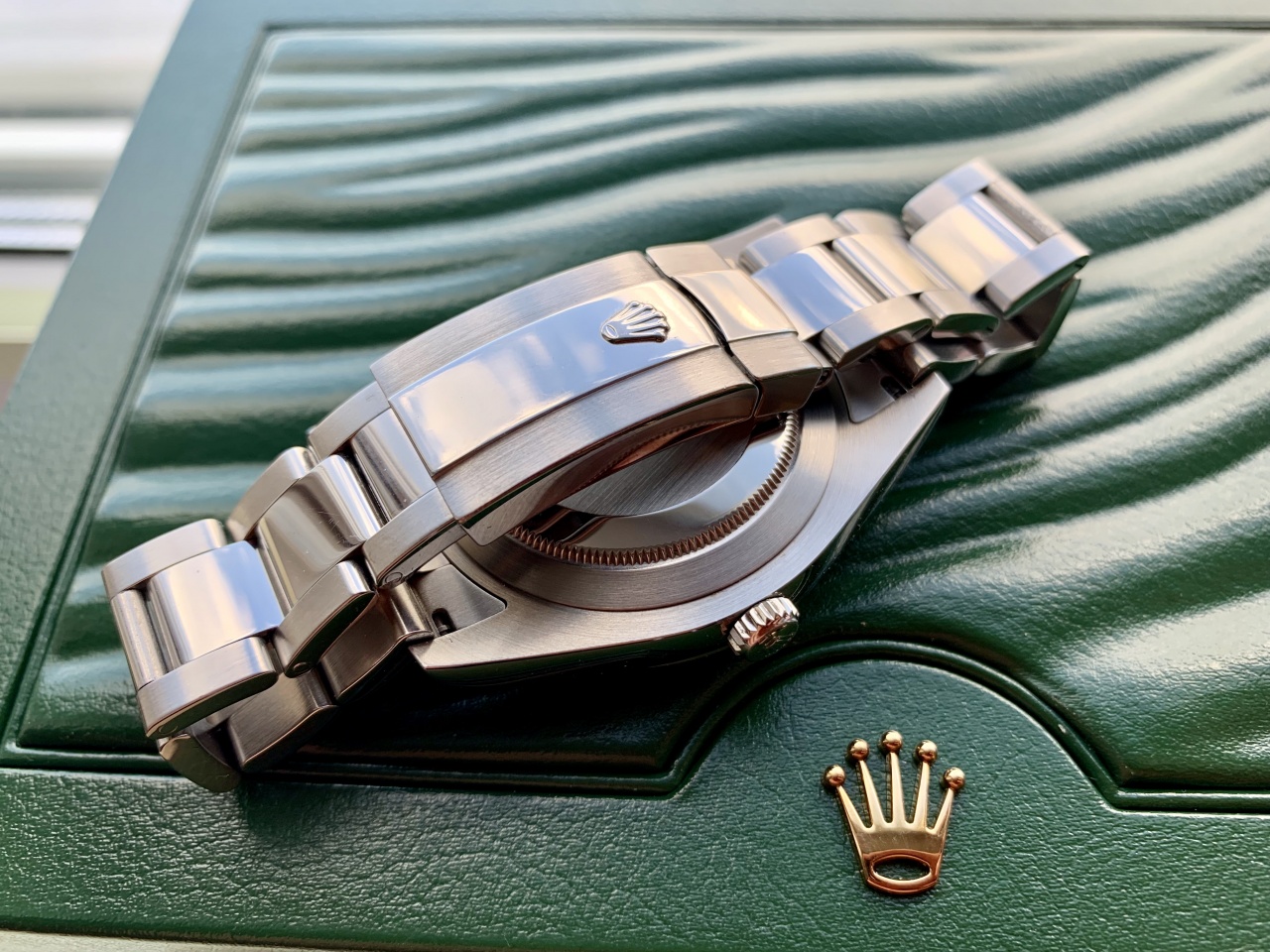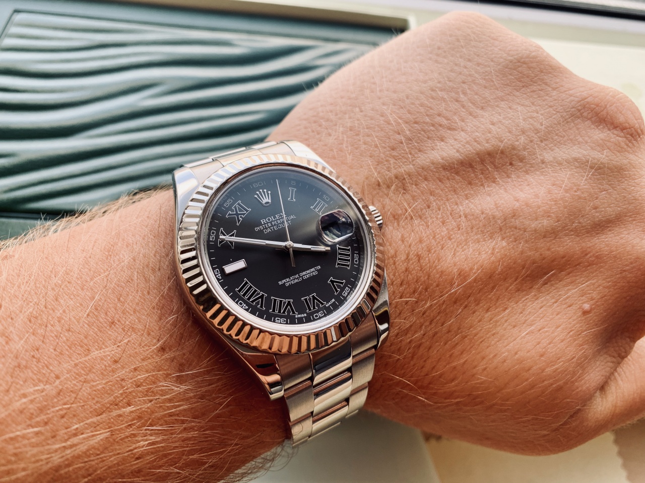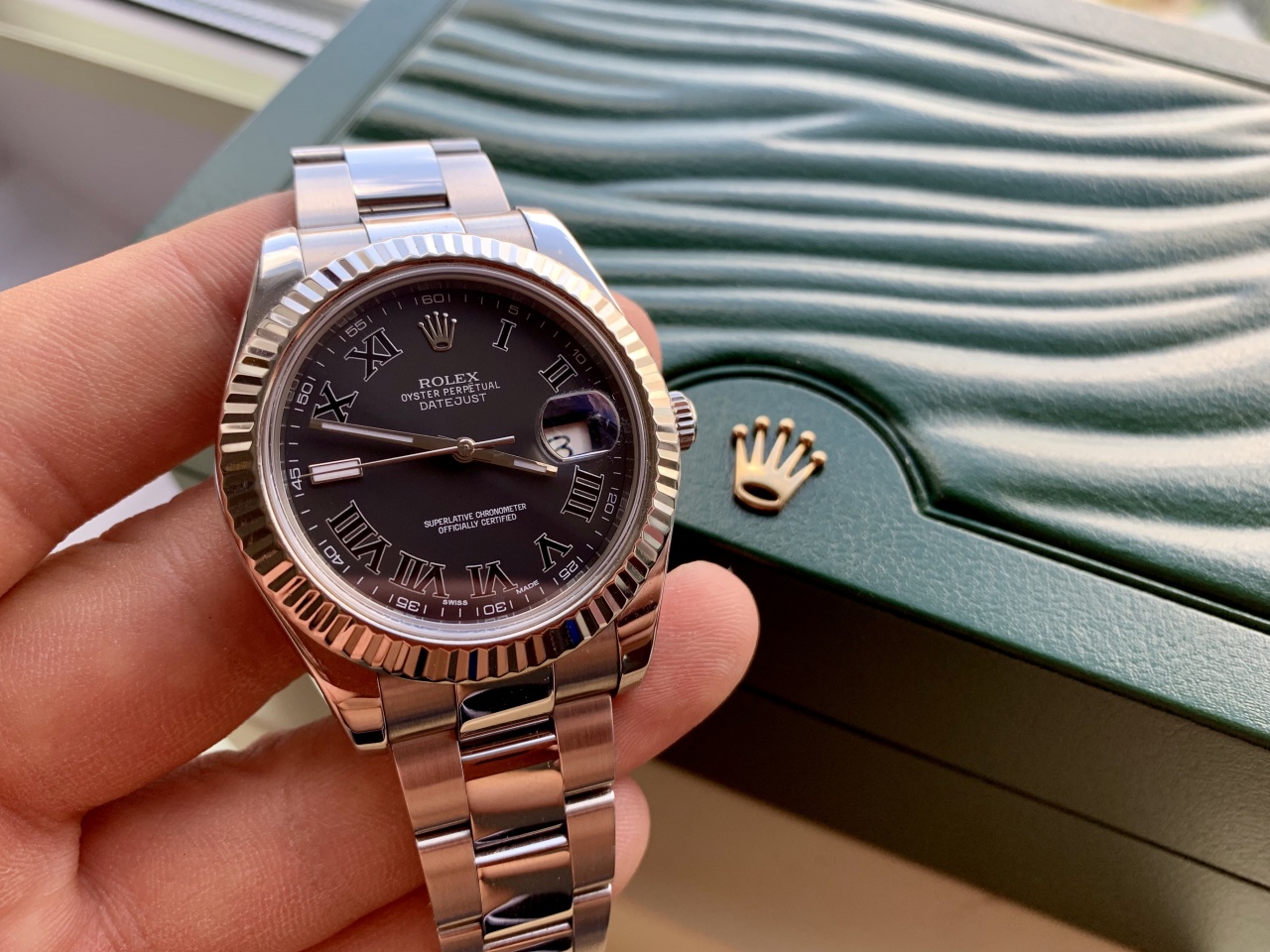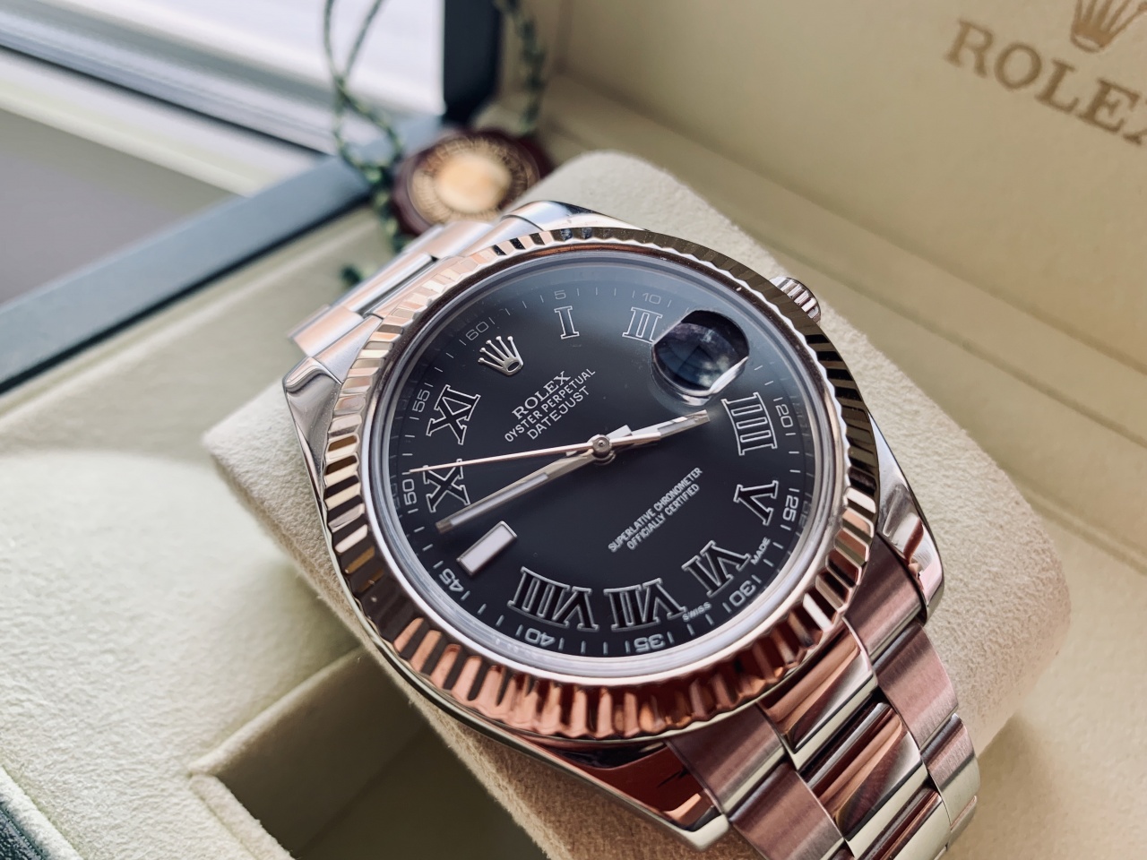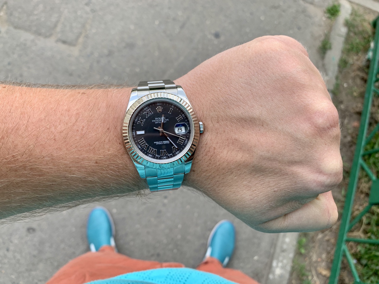 Идеальный Ролекс на все случаи жизни. Диаметр 41мм. Рифленый безель из белого золота. Довольно редкое исполнение циферблата пепельно-серого цвета с римской индикацией.