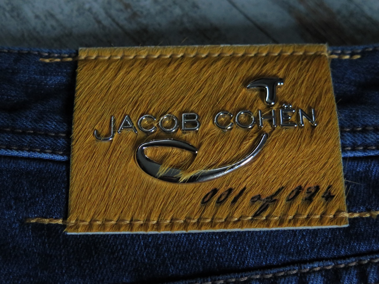 Сзади на правом бедре джинсы имеют фирменный ярлык из кожи пони жёлтого цвета с логотипом марки Jасоb Соhёn, выполненный из металла, что указывает на принадлежность к "лимитированной" линейке марки и порядковый номер -001