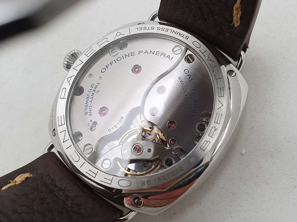 - Механика с ручным заводом, Panerai P.3000, баланс из сплава Glucydur®, противоударное устройство Incabloc®, запас хода 3 дня
