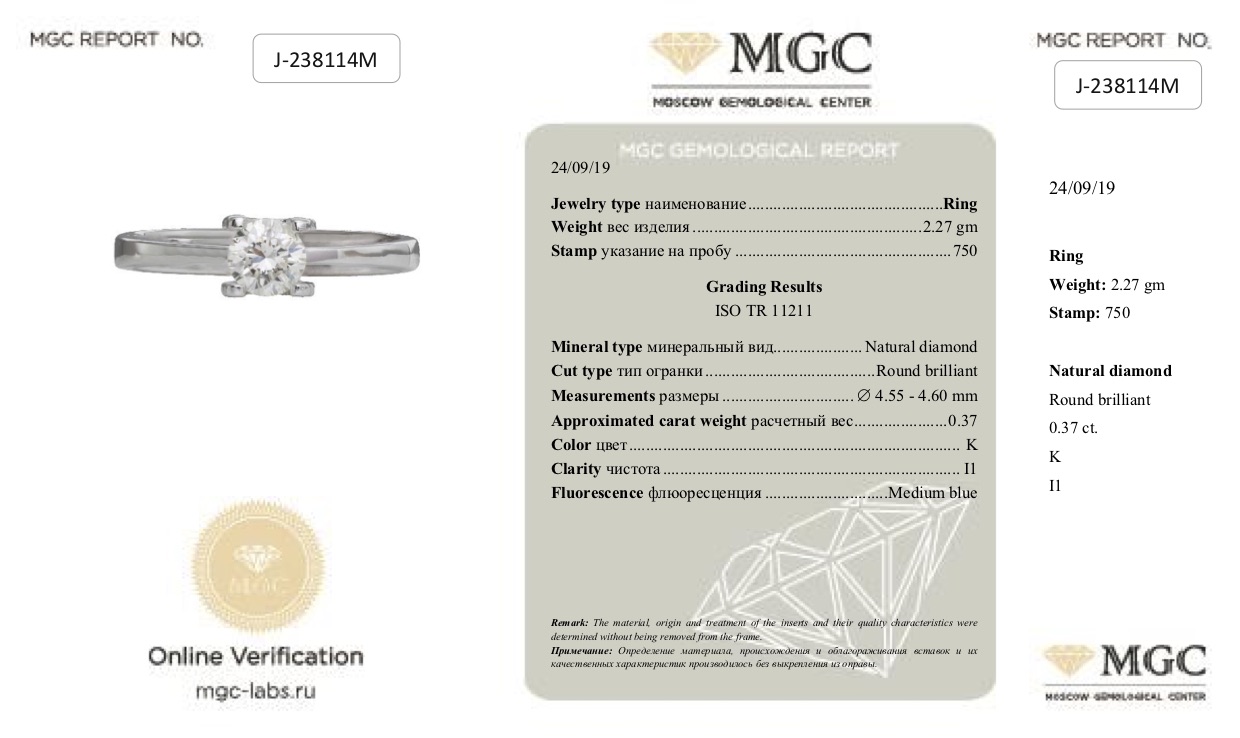 Кольцо из белого золота с бриллиантом 0,37 карат (сертификат МГЦ)
