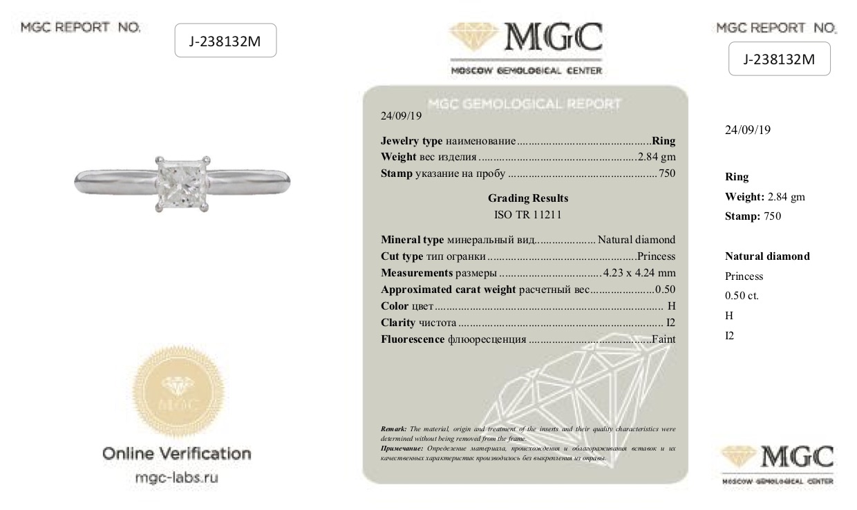 Кольцо из белого золота с бриллиантом 0,5 карат (сертификат МГЦ)