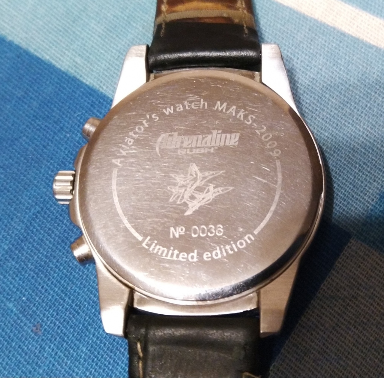 Сегодня вечером неожиданно для себя в какой-то коробочке нашел часы, которые мог найти лет пять... ) На циферблате у них логотип Adrenaline RUSH, на ребре часовой стрелки и на треугольной законцовке минутной стрелки имеется светонакопительный состав, на задней крышке-хлопушке помимо логотипа известного бренда сверху написано Aviators watch MAKS-2009, снизу - Limited edition и № 0036. Эти часы я выиграл участвуя в конкурсе Adrenaline RUSH, который они устроили к проведению авиасалона MAKS-2009, выпив всего четыре банки по 0,25 этого напитка. )) Я очень жалел, что потерялись эти часы, но вот сегодня они нашлись..! ))