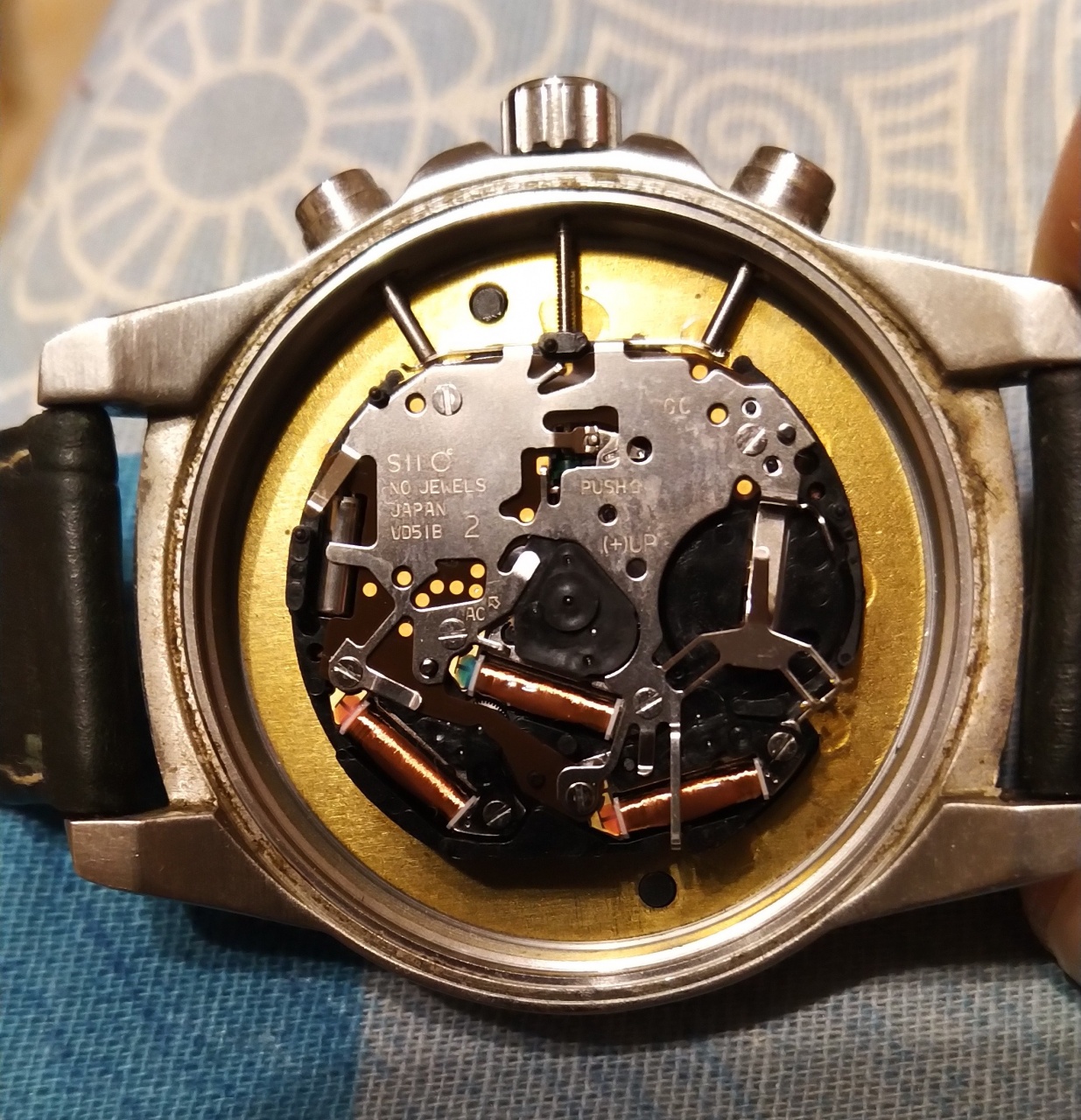 При вскрытии крышки-хлопушки был обнаружен механизм VD51B (HATTORI или SEIKO (SII)) версии 2, в котором был установлен элемент питания SONY SR920SW. При извлечении севшей батарейки на ней и на пластиковой кювете под батарейку были по одной малой капле электролита, с пластика механизма капля легко удалилась и это место было обработано спиртом, следов коррозии при беглом взгляде в очках без дополнительных инструментов обнаружено не было. К часам имеется фирменная жестяная коробка и инструкция. Вот такая неожиданная сегодняшняя находка. Единственное, что напрягает, это то, что я не смог закрыть хлопушку и завтра придётся идти в "дом быта"...