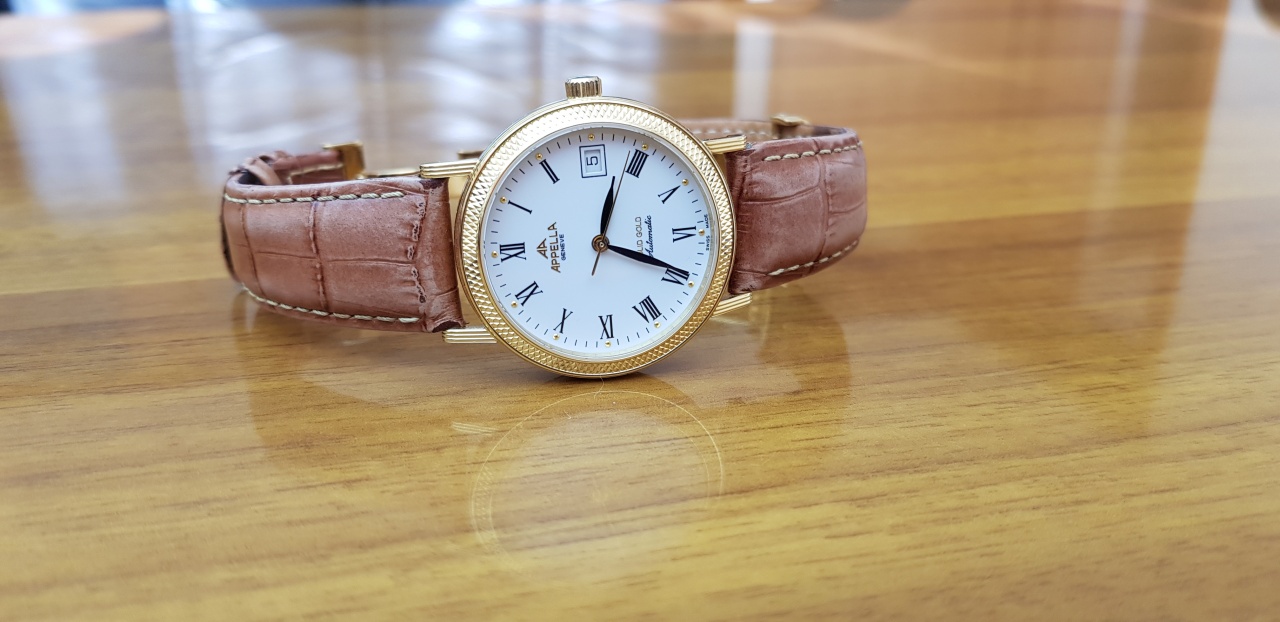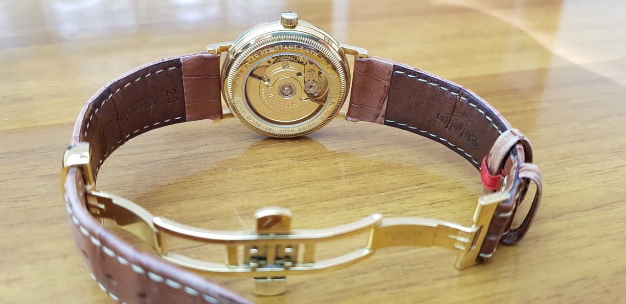 Appella Solid Gold 18K. Материал – золото. Классический дизайн, автоматический механизм, сапфировое стекло (царапин нет) рифлёный безель, прозрачная задняя крышка через которую виден механизм, кожаный ремень (заменял, но оригинальный тоже сохранил). Надеваются максимум пару месяцев в году, в основном лежат без дела. Имеется сертификат, инструкция, гарантийный талон, фирменная деревянная коробка, внешняя картонная упаковка тоже осталась, сохранён чек о покупке у офиц. представителя в 2010 году почти за 100т.р.! На руке сидят удобно, смотрятся очень красиво и дорого. Местонахождение – Тюмень.