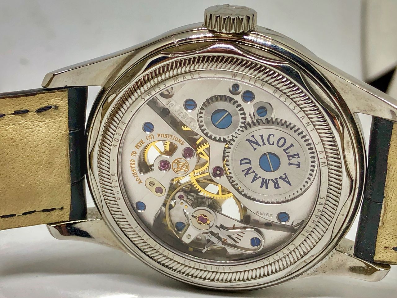 Калибр с ручным заводом AN0711A, воссозданный мастерами мануфактуры Armand Nicolet на основе калибра UT 600, 1957 года выпуска. Состоит из 127 деталей, частота 18000 v/ph, swan neck mechanism regulated in 5 positions. 18 камней, запас хода 36 часов.