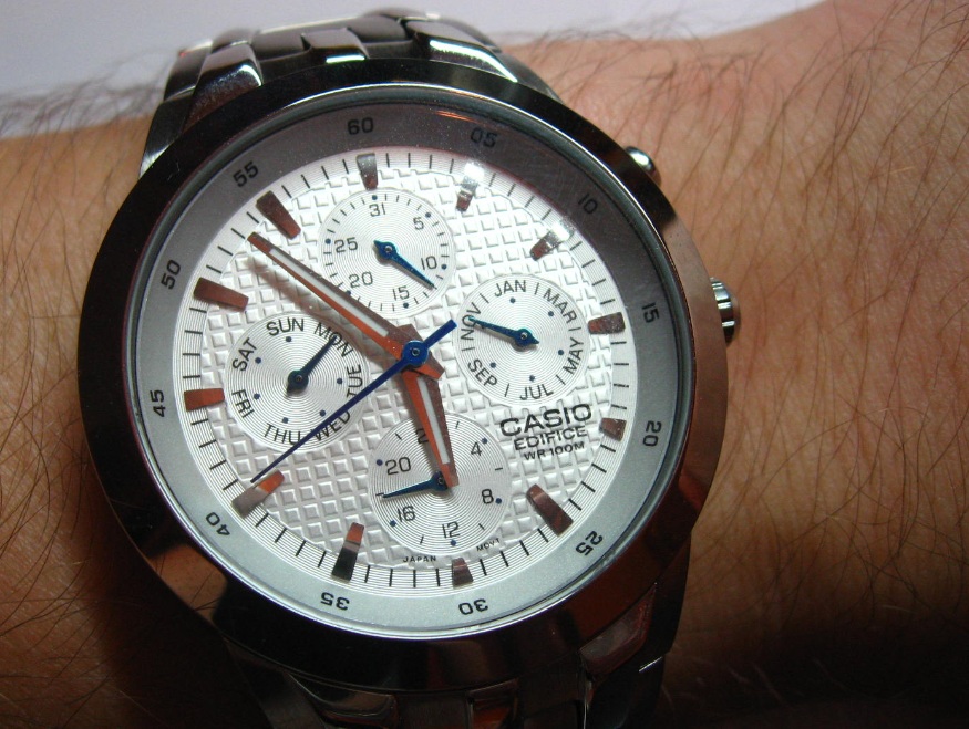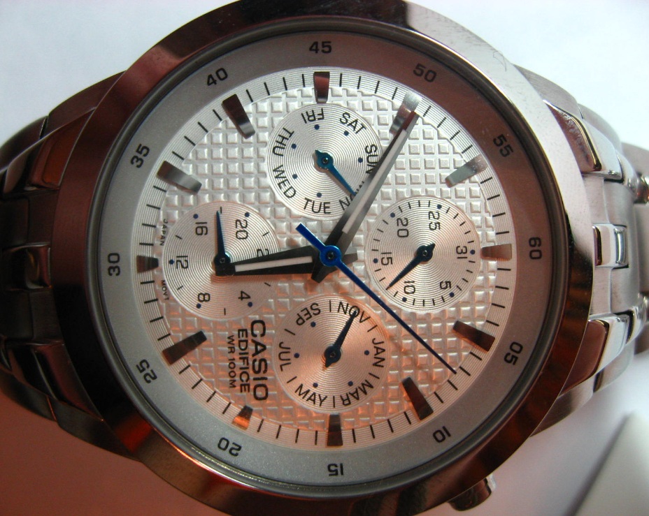 8 лет постоянно носил касио дата банк с пластиковым ремешком,который армию перенести не смог. В армии я работал с авиационным топливом. На глазах он начал трескаться, крошиться. В конце он рвался как бумага, как жевачка, которую жуешь 10 часов и она начинает крошиться, затем вставил железную "резинку". Часы мои были нашпигованы всякими функциями, в том числе 5 будильниками и 29 временными зонами, которыми за 8 лет я пользоваля несколько раз и то только потому, что они были. Электронных больше не хотелось. Поэтому в моих новых часах на цыферблате должно бить только то, чем я буду пользоваться. Всякие секундомеры, хронометры, таймеры, будильники, мировые времена с 29 часовыми поясами.... спросите себя, часто вы этим всем пользуетесь.Да конечно, если вы ведете жизнь агента 007. Неужели будильник в часах может разбудить. В армии мой будильник в часах будил 140 человек, которые были в расположении, но только не меня, поэтому я им и не пользовался. А дома меня будит КПК, подключенный через усилок к 60 ватным колонкам. При таком будильнике мертвый из-под земли начнет жаловаться, что его разбудили. Часы беру на повседневное ношение, не броские , не вызывающие, так чтобы под все, чтоб забывал о часах, и вспоминал только когда надо узнать время. (за мобилой в карман в 20 градусный мороз лезть не хочется)