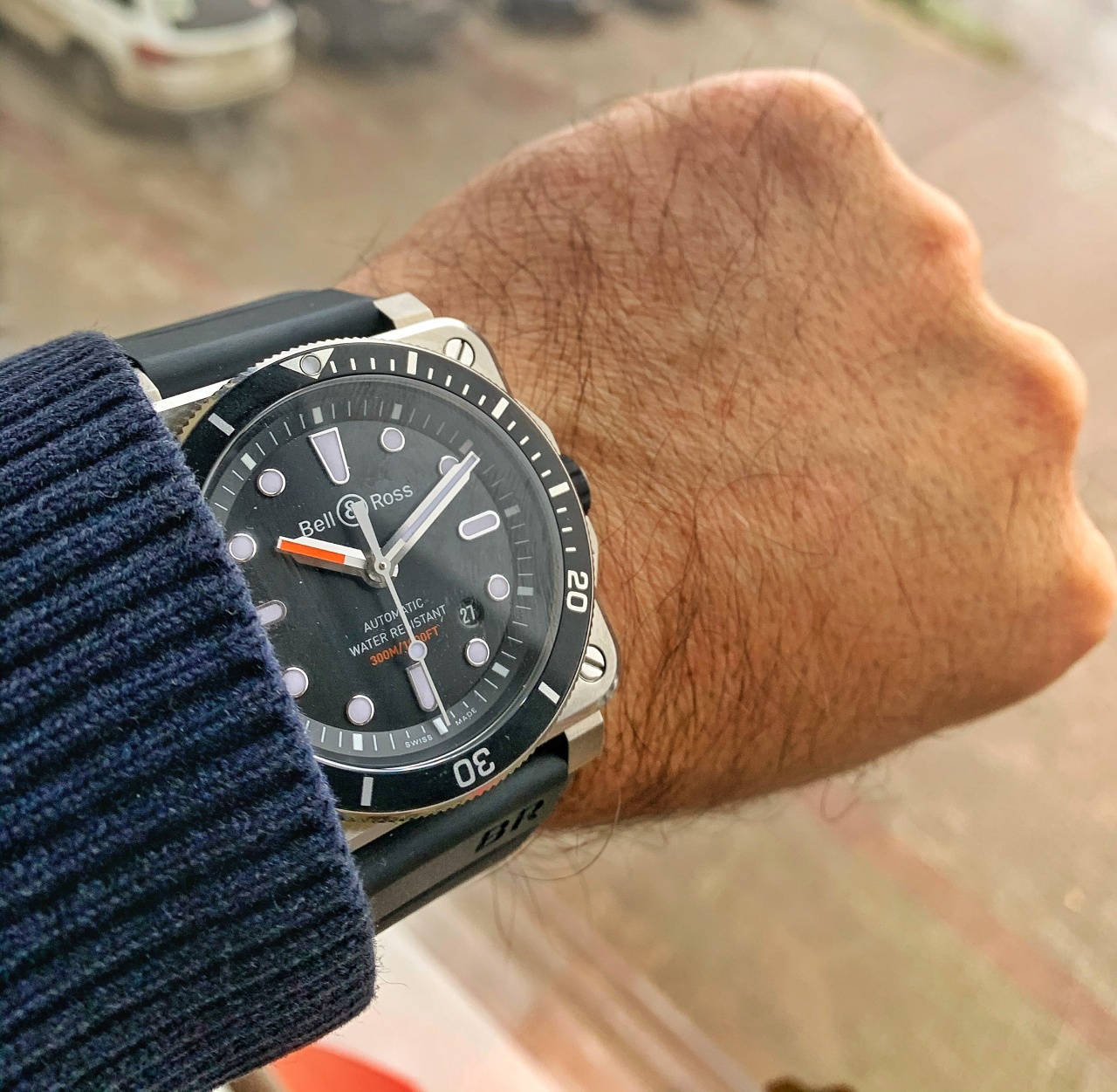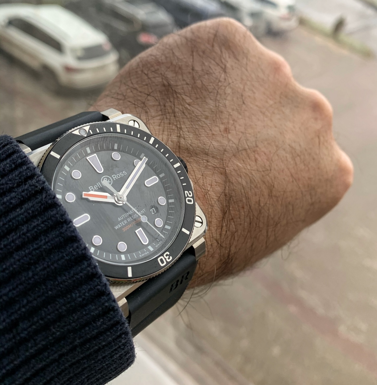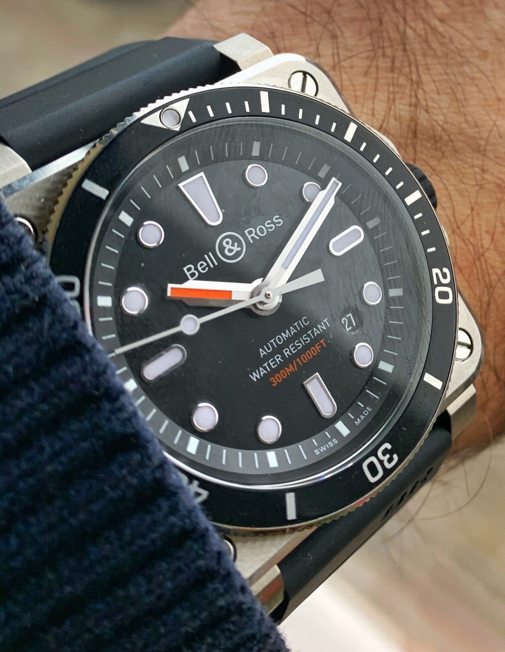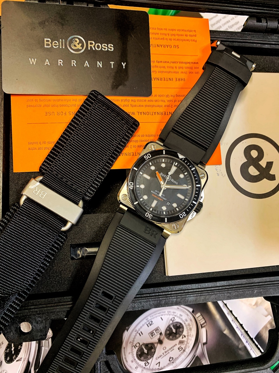 Пилоты в квадратном корпусе стали визитной карточкой Bell & Ross, но на этом они не остановились и стали выпускать небольшими тиражами и другие модели. Представленный к продаже, BR 03-92 Diver, свежий взгляд на часы для погружений под воду. Реализованы все атрибуты дайверских часов, однонаправленно вращающийся безель с люминесцентной меткой; закручивающаяся заводная головка с резиновым оребрением; ярчайшая подсветка стрелок и часовых меток; каучуковый ремешок и браслет из синтетической ткани с липучкой для быстрой регулировки на рукаве водолазного костюма; водозащита 300 метров.