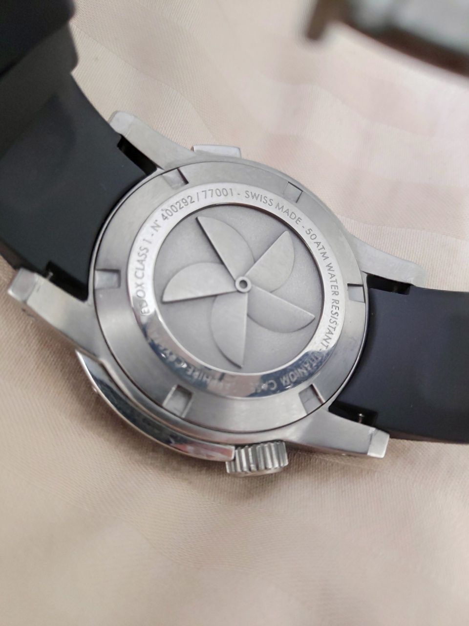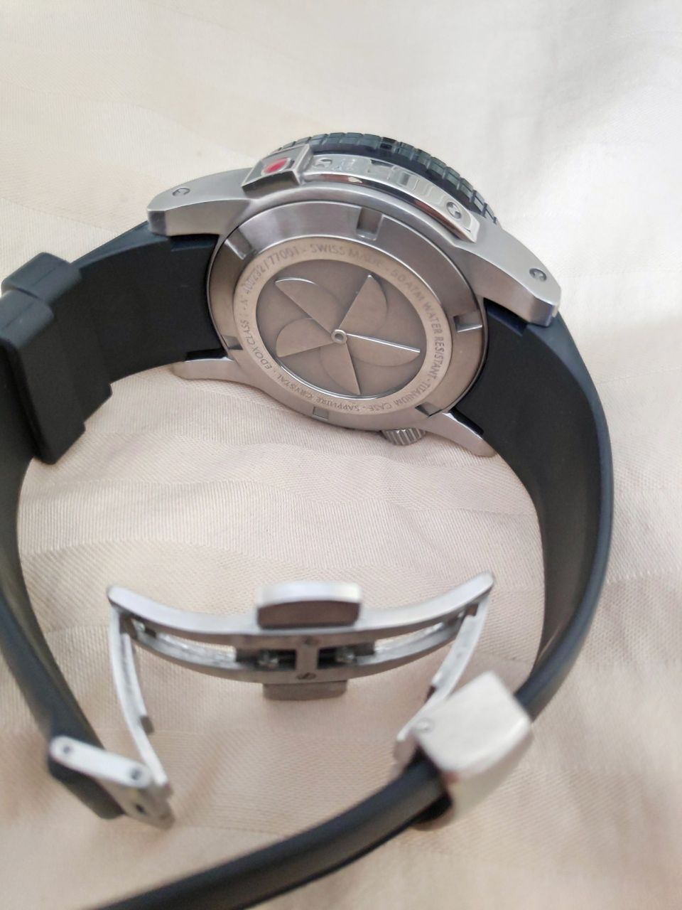"Еще одна модель из серии Class-1, официального хронометриста одноименных водных гонок, обладает повышенными защитными характеристиками и способностью переживать даже сильные удары о воду. 45-миллиметровый корпус из легчайшего титана способен выдерживать давление 50 Атм благодаря гелиевому клапану, а толщина сапфирового стекла, защищающего циферблат, составляет целых 3 мм.