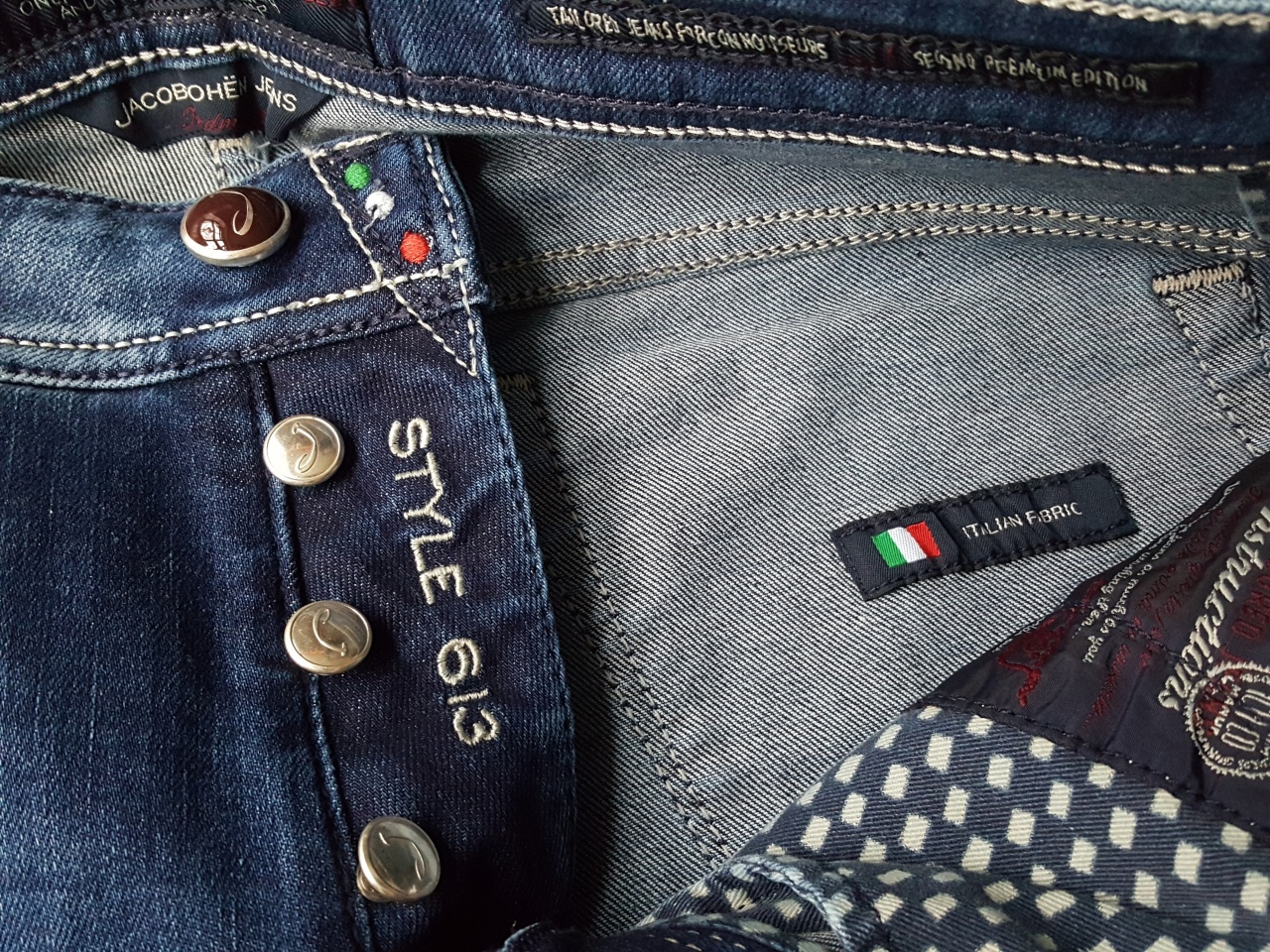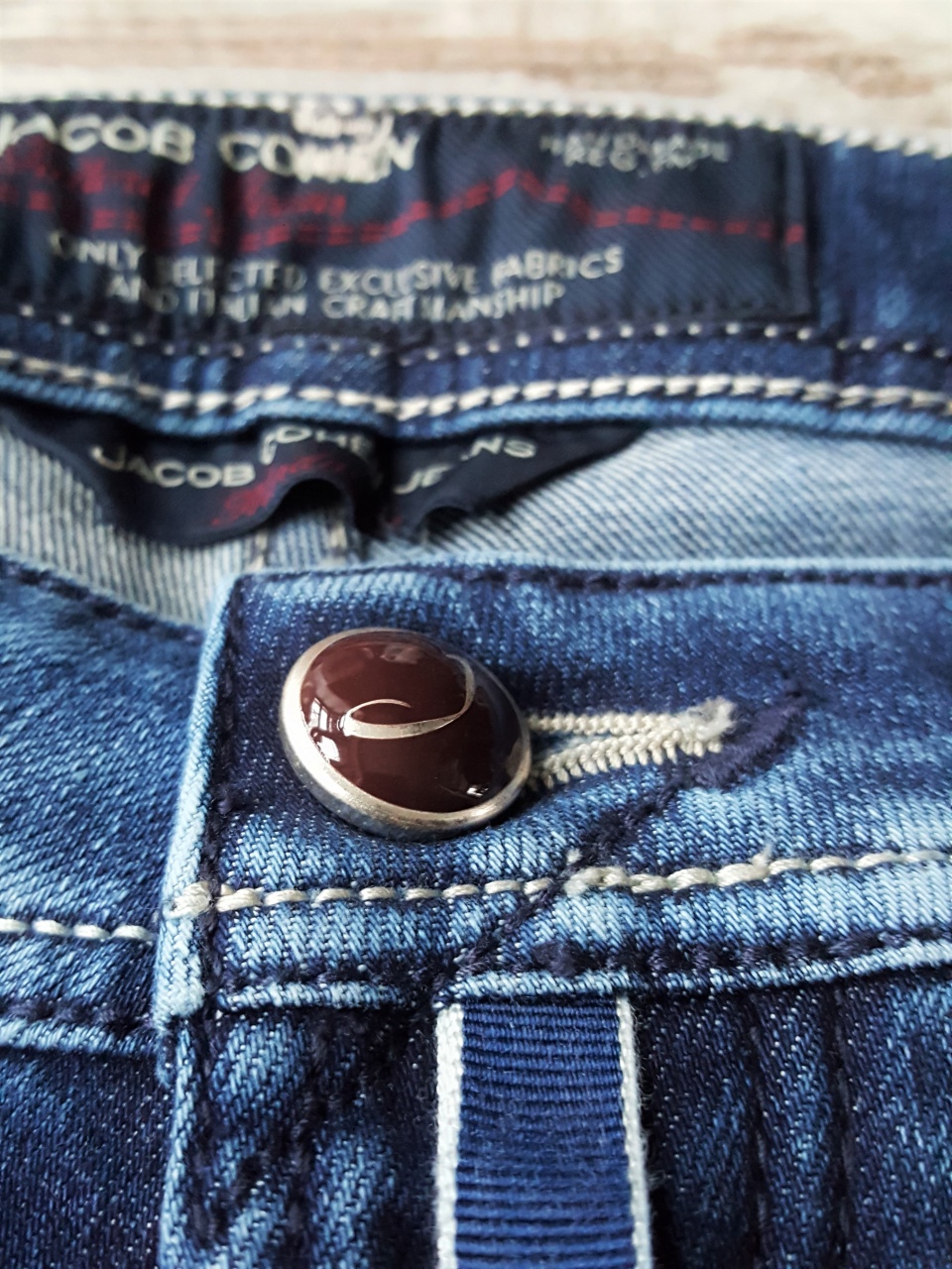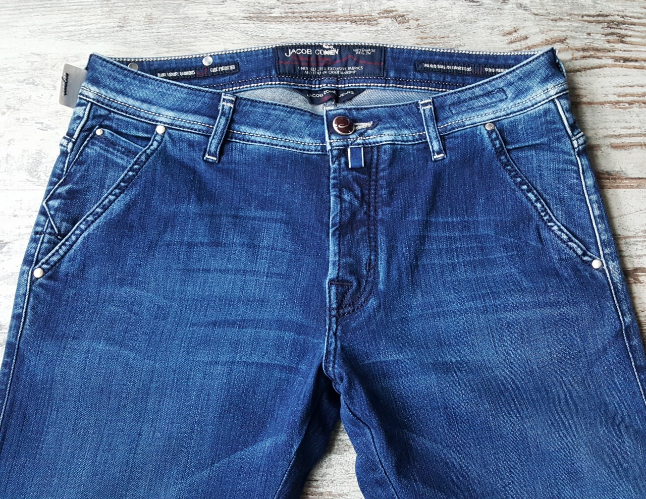Сзади на правом бедре джинсы имеют фирменный ярлык из натуральной кожи КРОКОДИЛА коричневого цвета с логотипом из серебра (!) марки Jасоb Соhеn.