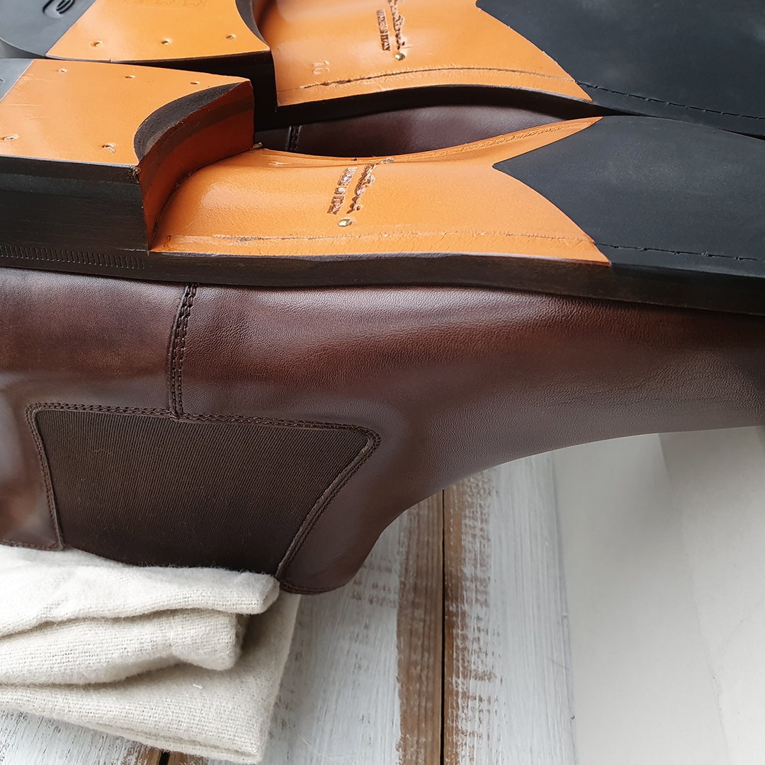 Подошва из комбинации кожи и резины с прошивным креплением к верху.