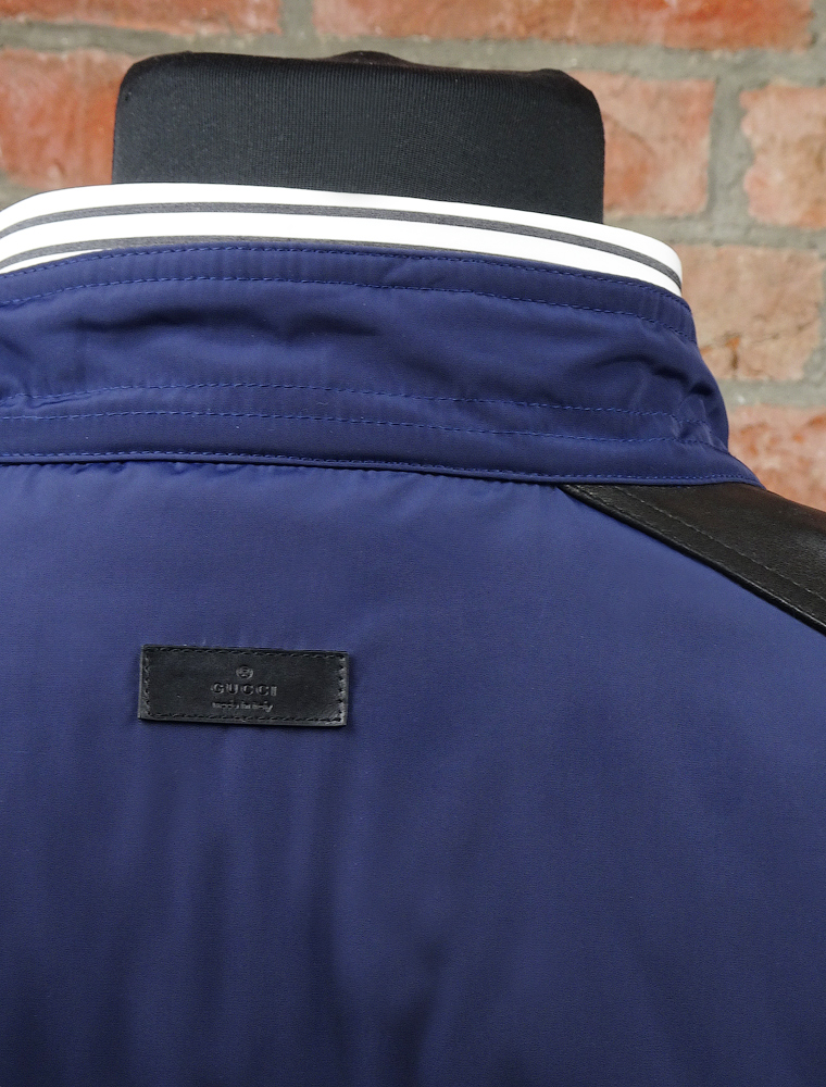 Воротник-стойка. Отлично сидит по фигуре. Плечи декорированы вставками из натуральной кожи черного цвета. Сзади на спине кожаная плашка с логотипом Gucci.