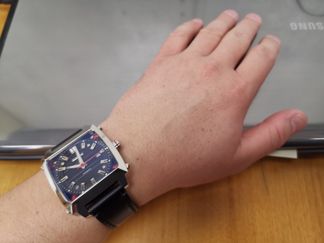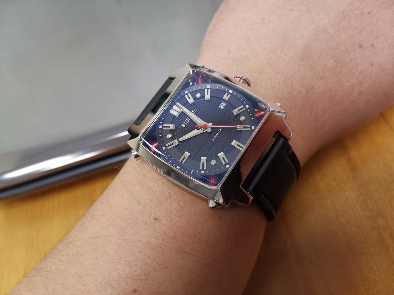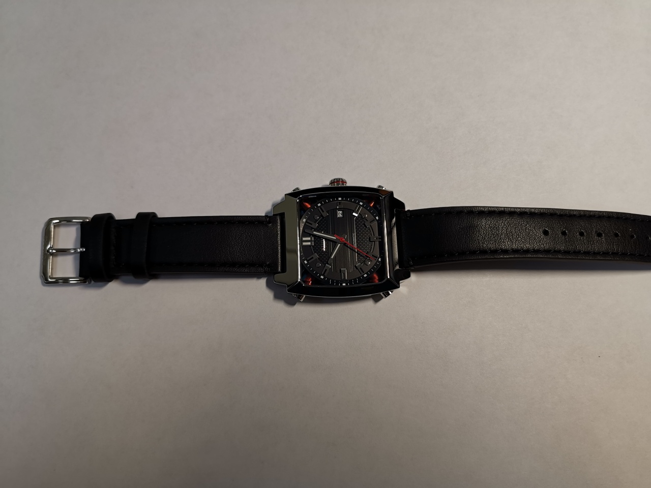 Теперь о часах: Часы изготовлены в квадратном корпусе из нержавеющей стали. С какого прототипа слизали дизайн я не задавался вопросом, он просто мне понравился, люблю квадратные часы. В качестве декоративных элементов корпуса, имеются некие винты с внутренним шестигранником, установленные под углом к корпусу, и уходящие глубоко, таким образом создаётся иллюзия, что они выполняют роль крепёжных элементов для механизма. Заводная головка крупная, имеет удобные насечки и красную полосу по периметру. Стекло над циферблатом минеральное, толстое, имеет скосы с теми же углами, что у корпуса. Циферблат многослойный с накладными часовыми обозначениями, объёмной брендовой надписью и 4 винтами, видимо для декора. Стрелки крупные трехгранные, имеют люм, довольно неплохой. Люм также имеет дата соответствующая 12 часам. Секундная стрелка красного цвета. В часах установлен механизм миёта 8215 с запасом хода, у моего экземпляра в районе 30-32 часов, при 40 оборотах заводной головки. Механизм шумноват как и все подобные. В целом часы выглядят приятно брутально, с диаметром корпуса 42мм без головки, 45мм с головкой, и 50мм от ушка до ушка. Ремешок кожаный двухслойный, толстый, сделан добротно. Бакля фигурная, с графировкой и полировкой.